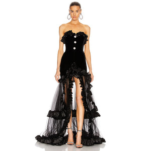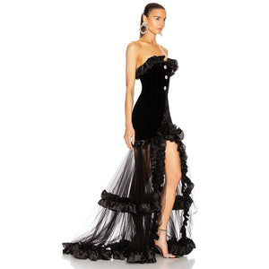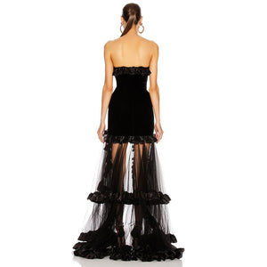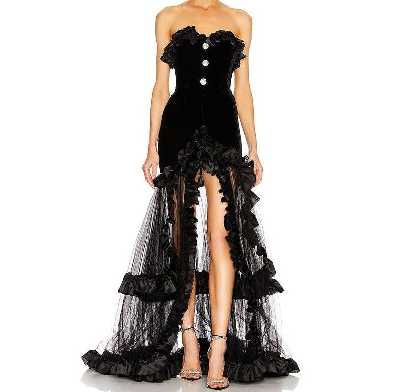 Elevate your evening look with the Ruffled Silk Satin-trimmed Crystal-embellished Velvet And Tulle Gown. With luxurious silk satin-trimmed ruffles, sparkling crystal embellishments, and smooth velvet and tulle fabric, this gown exudes boldness and adventure for the risk-taker in you!