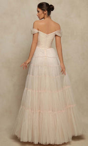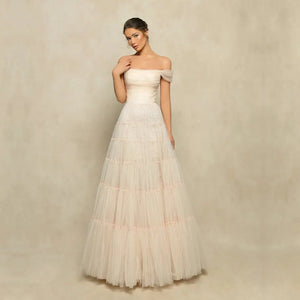 Unleash your inner charm with the Amina Gown. This stunning evening gown features a tiered A-line skirt with a tulle overlay adorned with delicate beadwork, adding a touch of subtle shimmer. The structured bodice boasts a sheer, ruched off-shoulder neckline, creating an elegant and radiant look. Dare to be bold in this captivating creation.