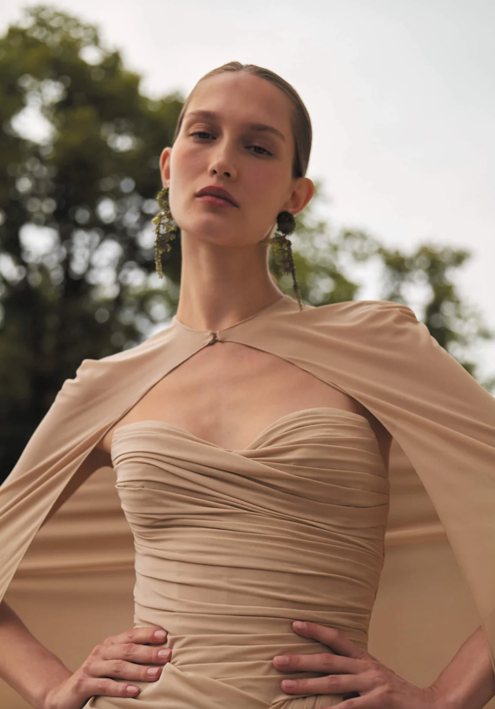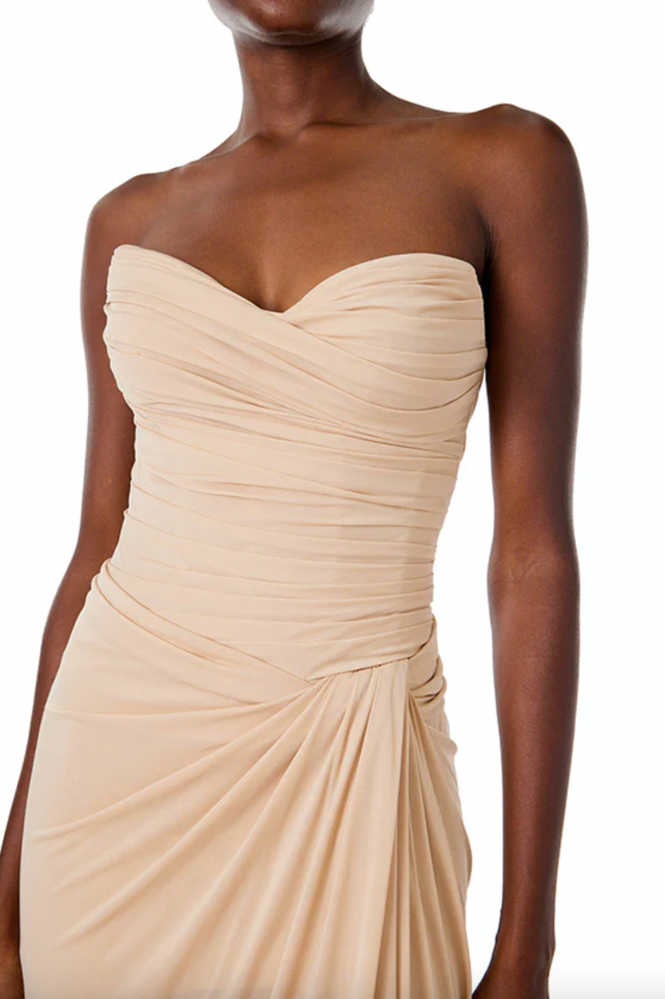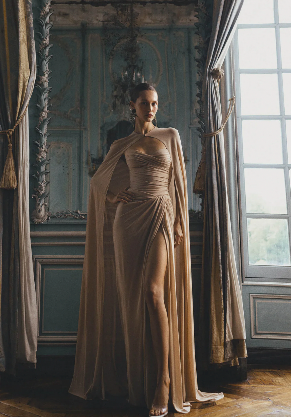 Capture the spotlight in the Arlow Gown! This gorgeous, draped gown features a sweetheart neckline and front slit, perfect for creating an elegant and flattering silhouette. Made with comfortable and sleek matte jersey fabric. Complete your red carpet look by pairing it with our Floor Length Jersey Cape.