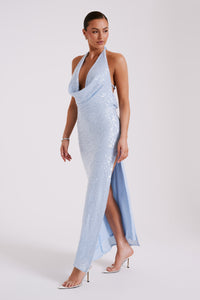As a formal dress, the Blakely Maxi offers intricate sequin detailing and a halter neckline. Its ice blue color and glamorous design are perfect for any special event, instilling confidence and sophistication for the wearer.