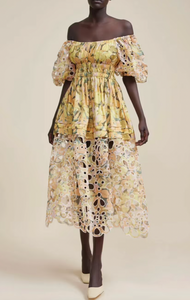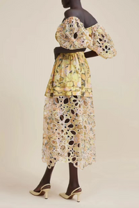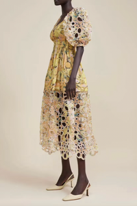 Indulge in elegance with the Bradlee Dress. The stunning laser cut detail adds a touch of sophistication to the scooped neckline, while the elasticated waist accentuates your figure. The asymmetrical hem adds a unique touch, making this dress a must-have for any special occasion.
