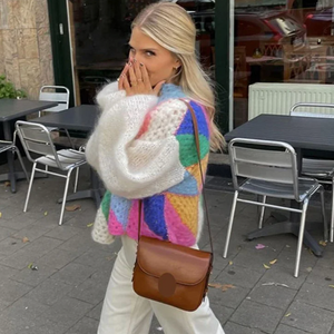 We are presenting to you the Cardigan Jennifer - the perfect addition to your wardrobe. This new colorful patchwork design features lantern sleeves, O neck, and a loose knitwear fit. Crafted with high-quality materials and intricate crochet details, this cardigan offers both style and comfort. Upgrade your look with this versatile and trendy piece.