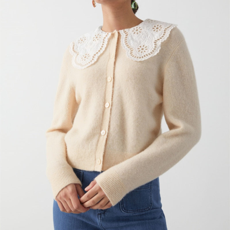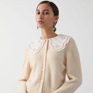 This knitted cardigan showcases a beautifully embroidered statement collar, adding a touch of elegance to any outfit. Made with quality materials, it is perfect for cooler days and offers a stylish and sophisticated look. Elevate your wardrobe with the Cardigan Nia.