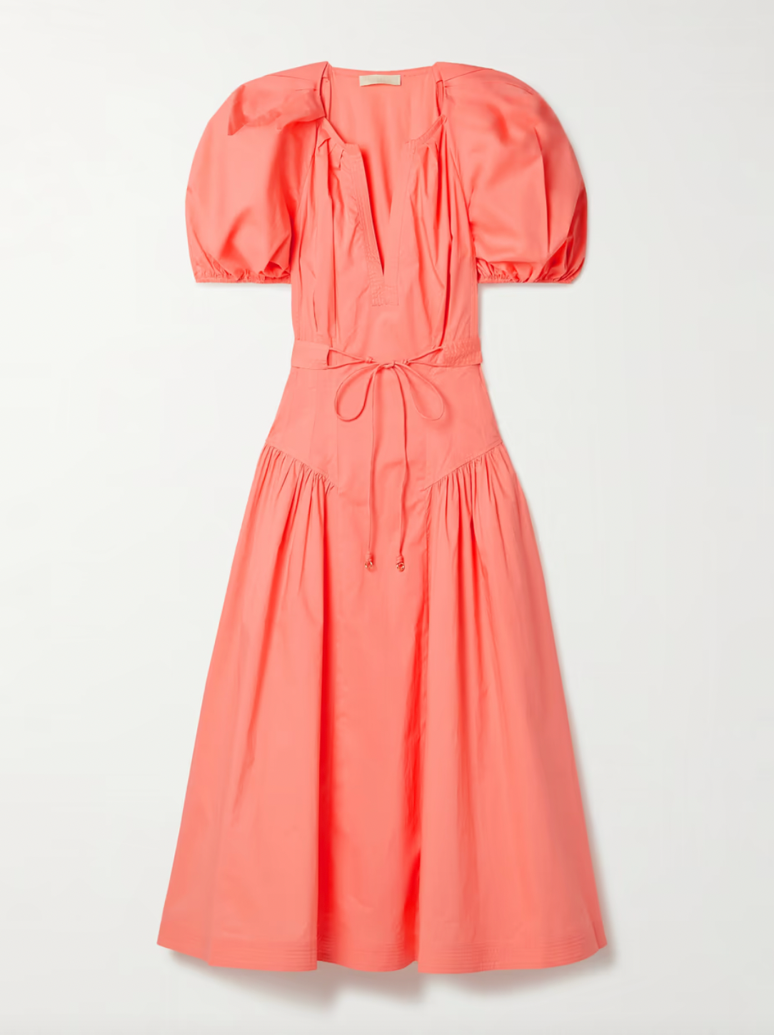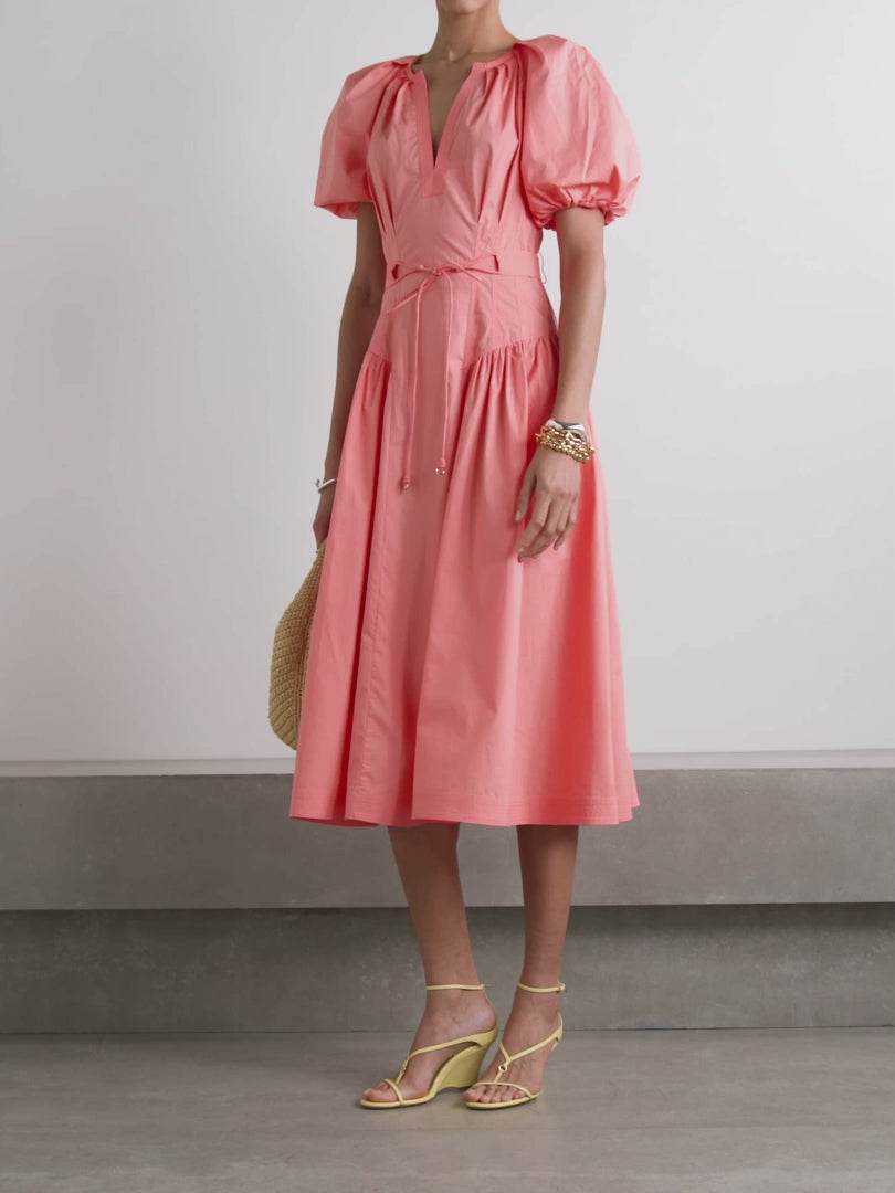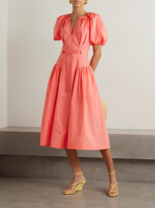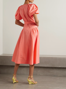 Elevate your summer wardrobe with the Carina Poplin Midi Dress. Crafted from lightweight cotton-poplin, this vibrant coral dress features strategic pleats and a self-tie belt to cinch your waist. The puffed sleeves and gathered panels add a touch of volume, making it perfect for any event.