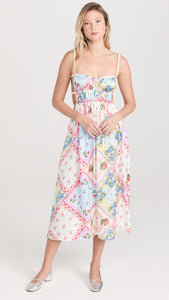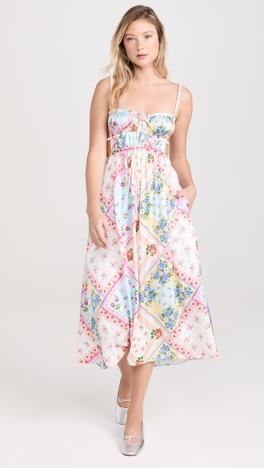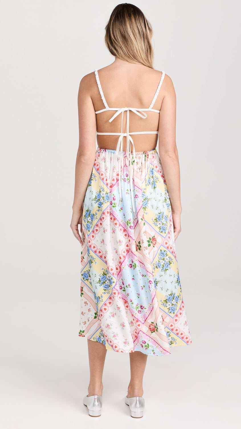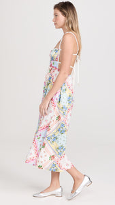 Get ready to turn heads in the Cassandra Floral Dress! Made from lightweight, non-stretch satin, this dress features a stunning floral patchwork print and a crochet rose applique with a bow at the bust. The playful open back with ties and sweetheart neckline add a touch of fun to this dress. It also has ruched elastic shoulder straps, a covered elastic waistband, and convenient on-seam hip pockets.