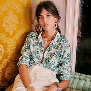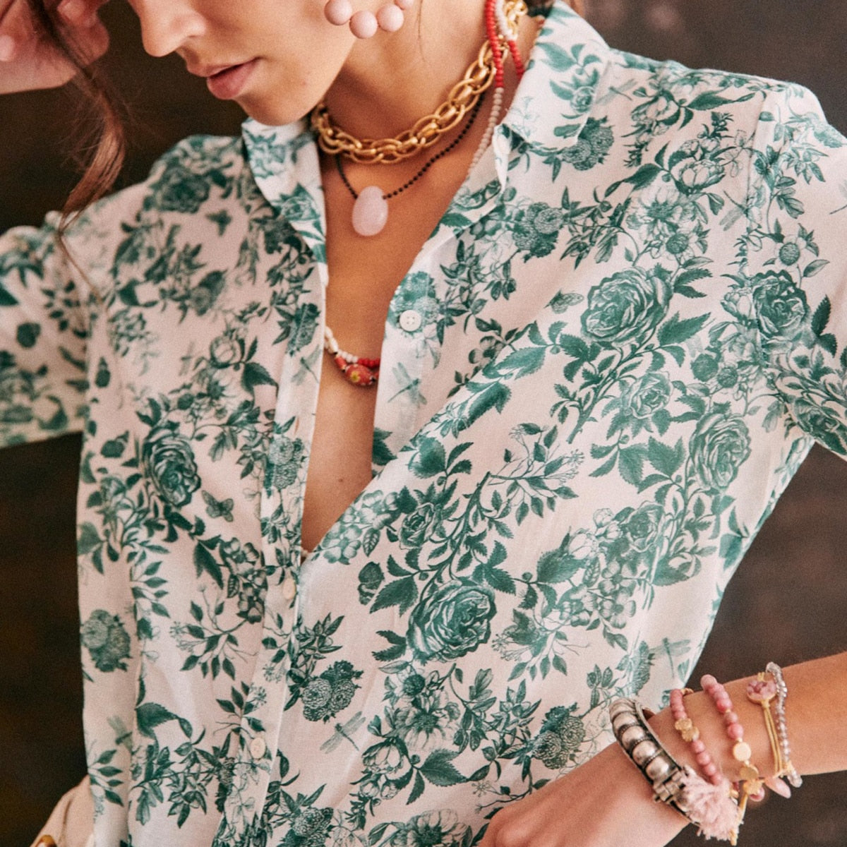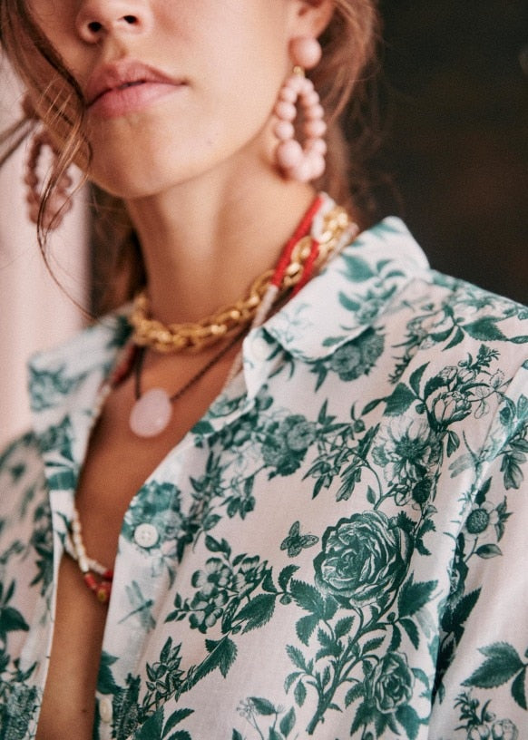 Indulge in the breathtaking beauty of the Chemise Pierro with its stunning maxi flowers on a vibrant blue background. Enhance any outfit with this statement piece, perfect for a day out or a night on the town. Elevate your style with the Chemise Pierro!