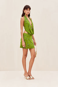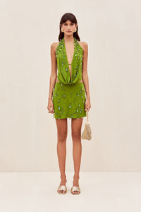 Take on the bold and daring with the Issey dress. This mini dress features a vibrant apple green color and hand-sewn teardrop bead embellishments that add a touch of luxury. With a halterneck, backless design, and plunging neckline, this dress exudes confidence and adventure. The cowl effect and straight hem complete the look for a daring statement.