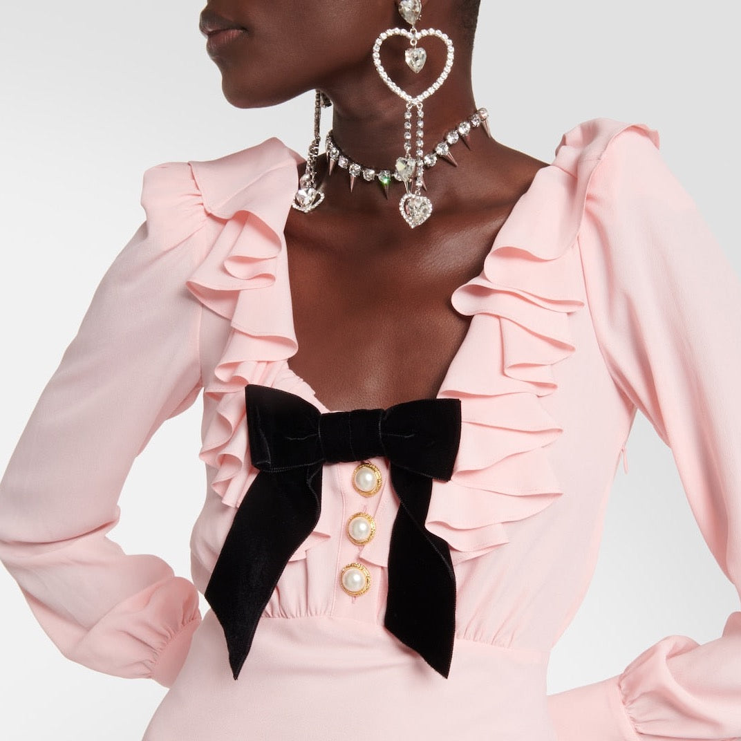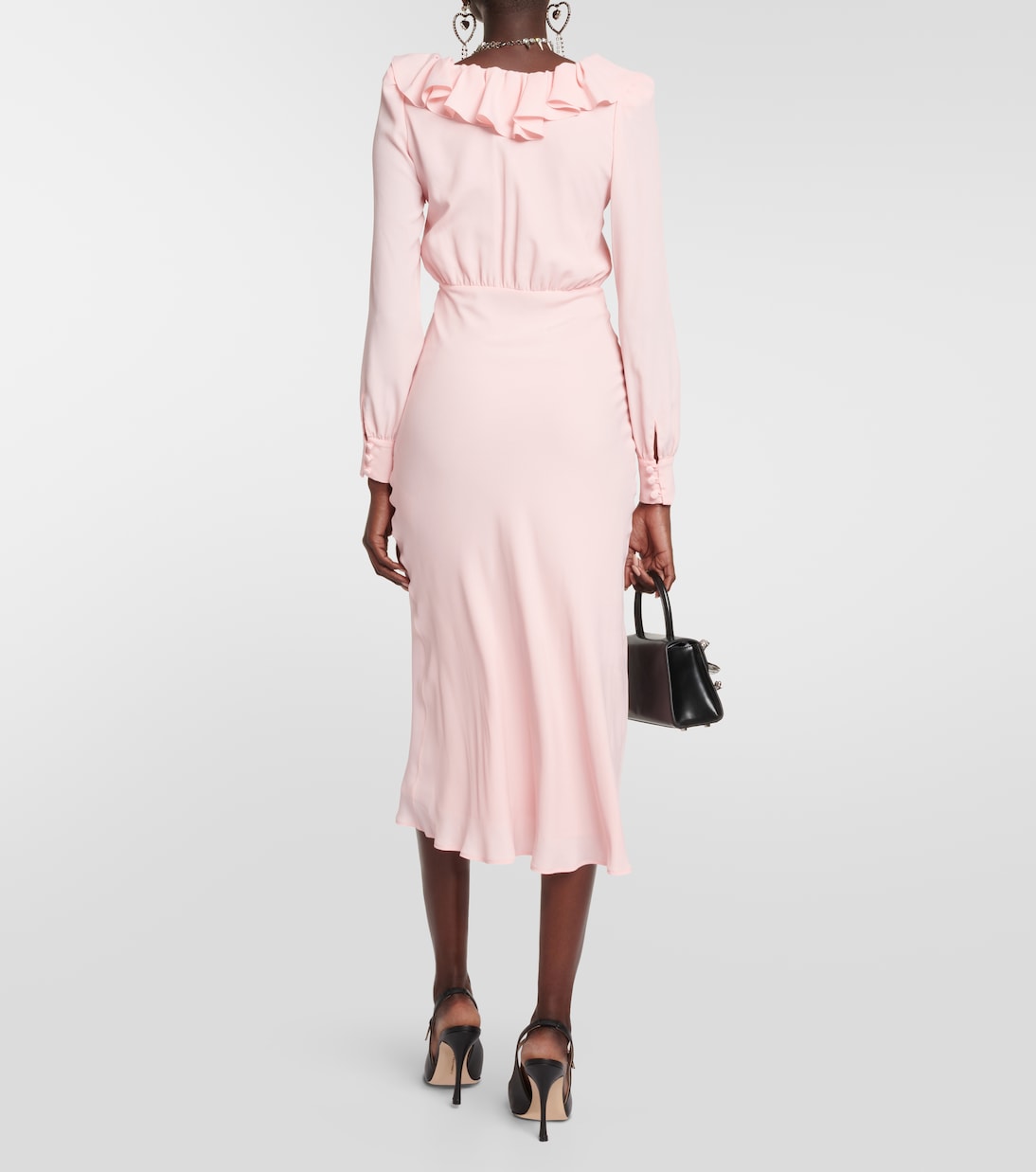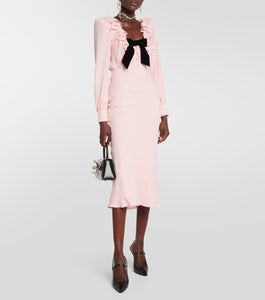This Embellished silk-blend midi dress features a unique neck ruffle that provides a flattering and slimming effect. The high-end celebrity style adds a touch of glamour and sophistication to any occasion. Elevate your wardrobe with this expertly designed and fashionable dress.