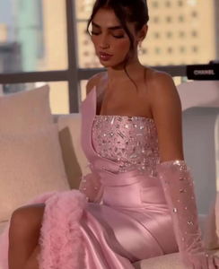 This elegant Dress Alina is designed for formal events and parties. The strapless crystal prom dress features a mermaid silhouette, ruffled details, and a side slit for a touch of glamour. The oversleeves add sophistication while keeping you covered. Make a statement with this new design formal evening gown.