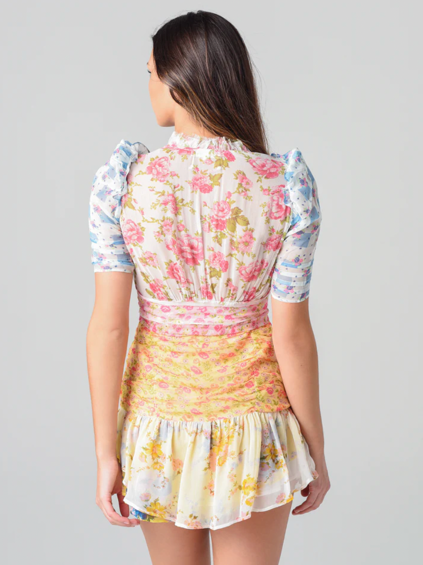 Elevate your wardrobe with our luxurious Dress Arlo. Featuring short puff sleeves, a striking floral print, and a retro-inspired silhouette, this dress will make you stand out in any crowd. Pleated ruffle detailing and a delicate tie bow add an extra touch of sophistication to this must-have piece.