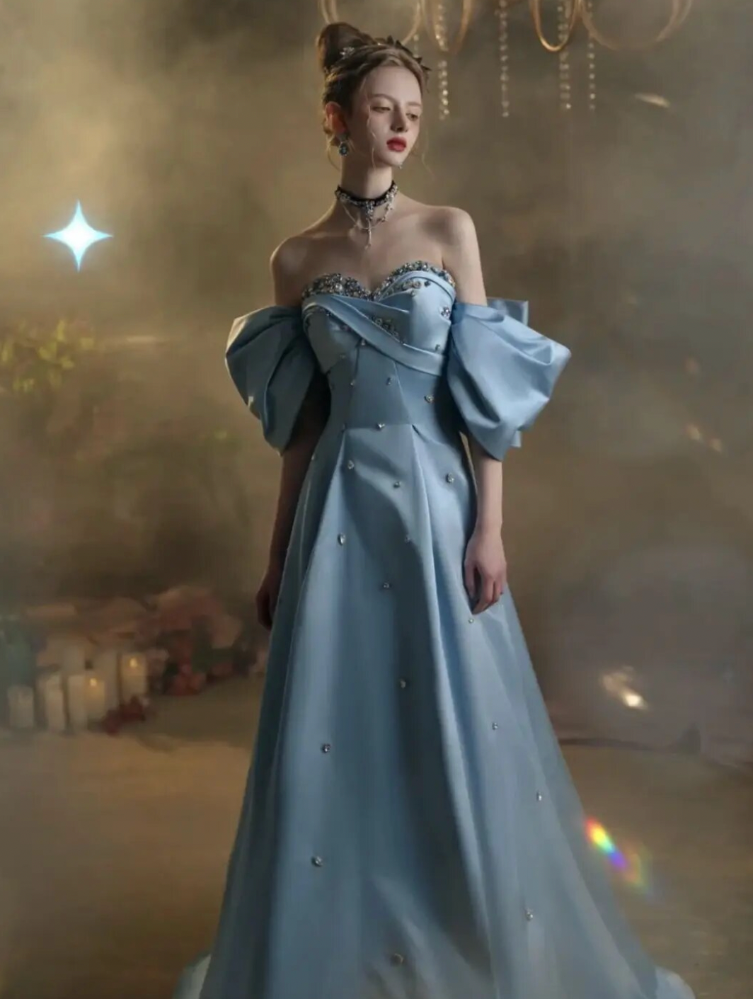 Elevate your evening look with the Dress Aurora. Crafted from luxurious satin in a stunning blue hue, this dress features intricate beading and a boat neck for a touch of elegance. The strapless design, crystal detailing, and princess length make it perfect for a glamorous banquet or prom. Backless with a pleated bow, this dress exudes sophistication.