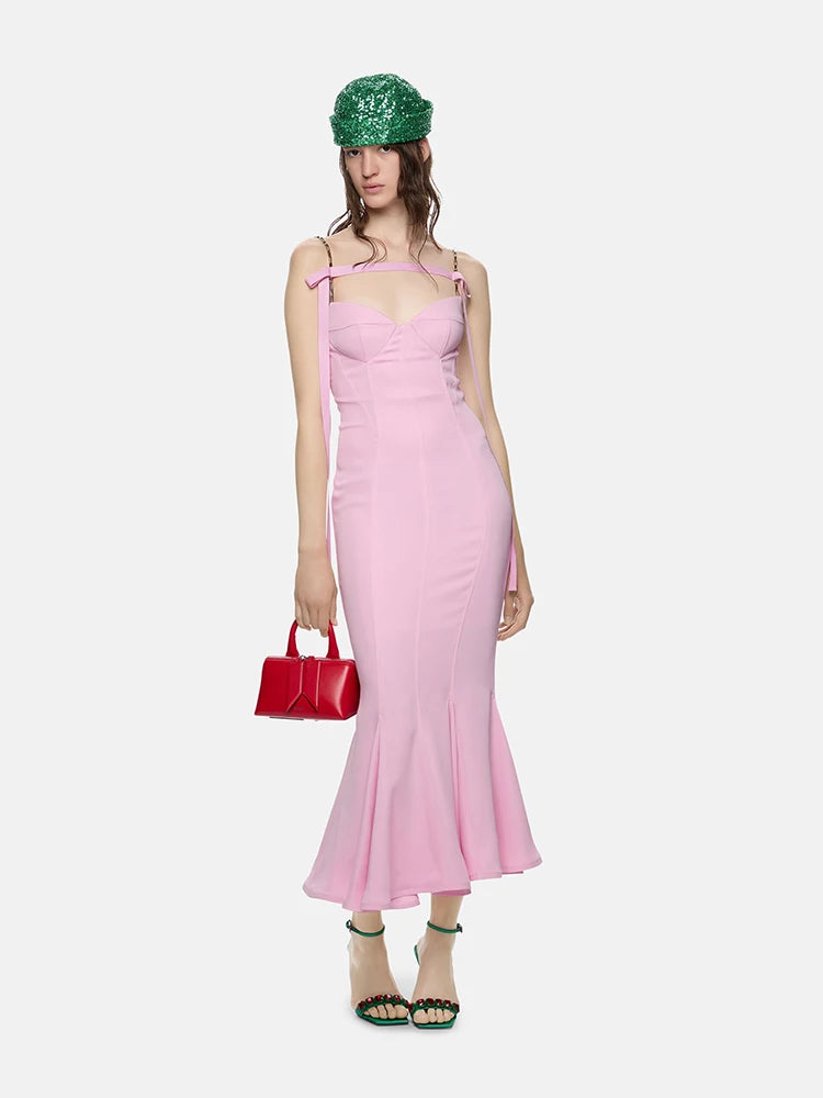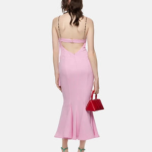 Introducing our stunning Dress Beath, crafted with delicate sugar pink fabric and intricate fishtail cutouts. Featuring thin straps and a sweeping fishtail design, this dress exudes luxury and sophistication. Elevate your wardrobe with this elegant and exclusive piece.