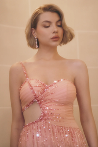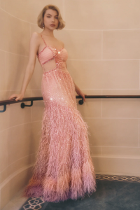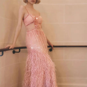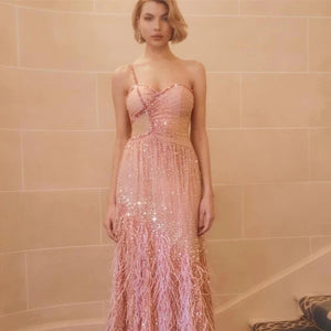 Stay in style with our Dress Flutter, featuring a one-shoulder design and delicate spaghetti straps. The mermaid silhouette hugs your curves, while the floor-length hem adds an elegant touch. Adorned with feathers and sequins, this dress is the epitome of fashion-forward luxury. Indulge in sophistication and grace with Dress Flutter.