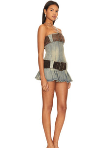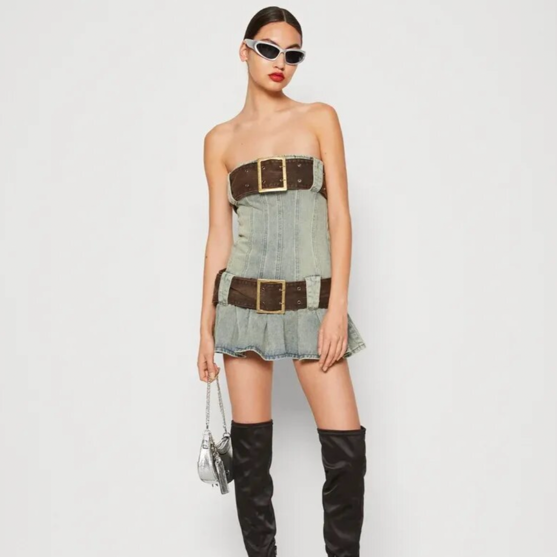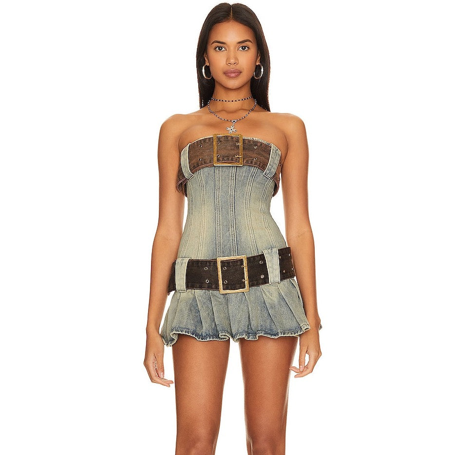 Introducing the Chelsea Denim Kilt Mini Dress - the perfect combination of style and comfort! This corset mini dress features an off-shoulder design that accentuates your curves, while the denim fabric and pleated details add a touch of elegance. Complete with a belt that cinches your waist, this body-hugging dress is a must-have for any fashion-forward wardrobe!