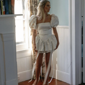 Get ready to make a statement with the Dress Loretta! Featuring a vintage satin design and elegant lantern sleeves, this custom made dress is perfect for any after party or wedding. The square neck and ribbon add a classic touch, making you look and feel absolutely stunning. Stand out and feel confident in this beautiful and cute dress.