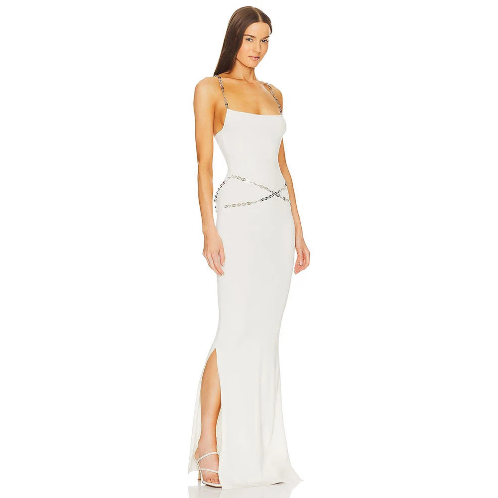 The Dress Macie is a must-have for any fashion-forward woman. This sexy piece features Italian noodle straps and a waistchain design that will accentuate your curves. The sleeveless construction adds a touch of elegance and the bodycon silhouette highlights your natural figure. Look and feel confident in this stylish dress.