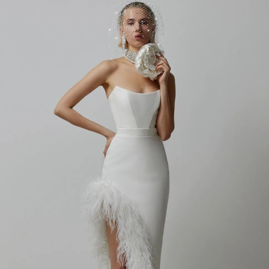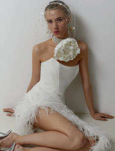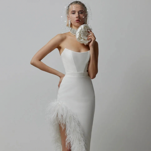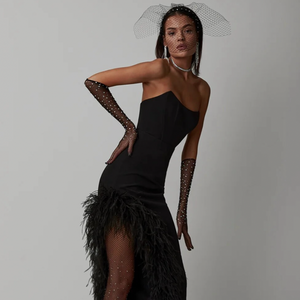 Upgrade your wardrobe with the Dress Marija. This elegant bodycon dress features a unique feathers patchwork and a sexy off-shoulder design, perfect for any special occasion. The strapless style adds a touch of sophistication to your look. Made for the confident modern woman.