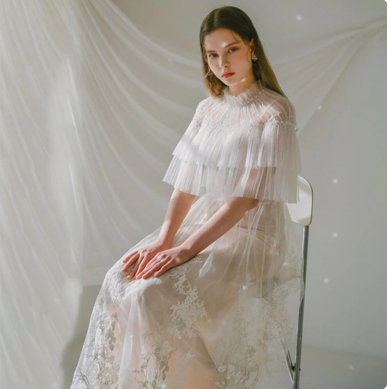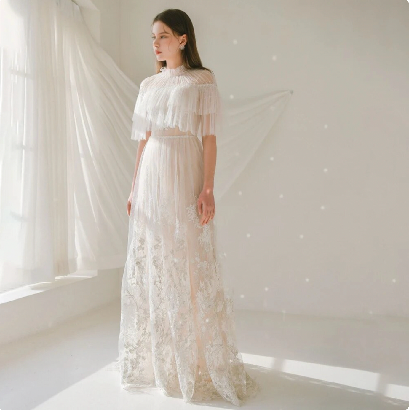 Introducing Dress Megan, the perfect blend of vintage charm and modern elegance. This stunning maxi dress features high neck, cap sleeves, and delicate embroidery lace with beads for a customized look. Say "I do" in style with this one-of-a-kind wedding gown.