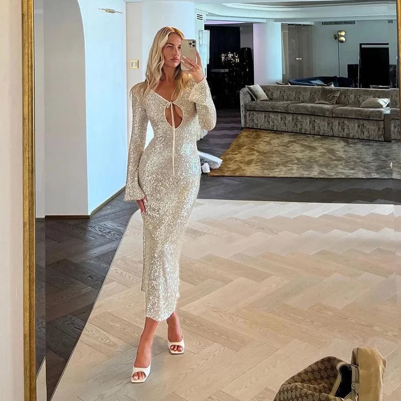 Introducing the elegant Dress Melania. Featuring sequins, hollow out lace, and a sexy V-neck wrap design, this maxi dress is perfect for making a statement at any event. The intricate details and form-fitting silhouette will make any woman feel confident and stylish. Dress to impress with Dress Melania.