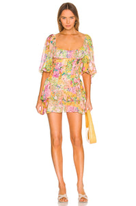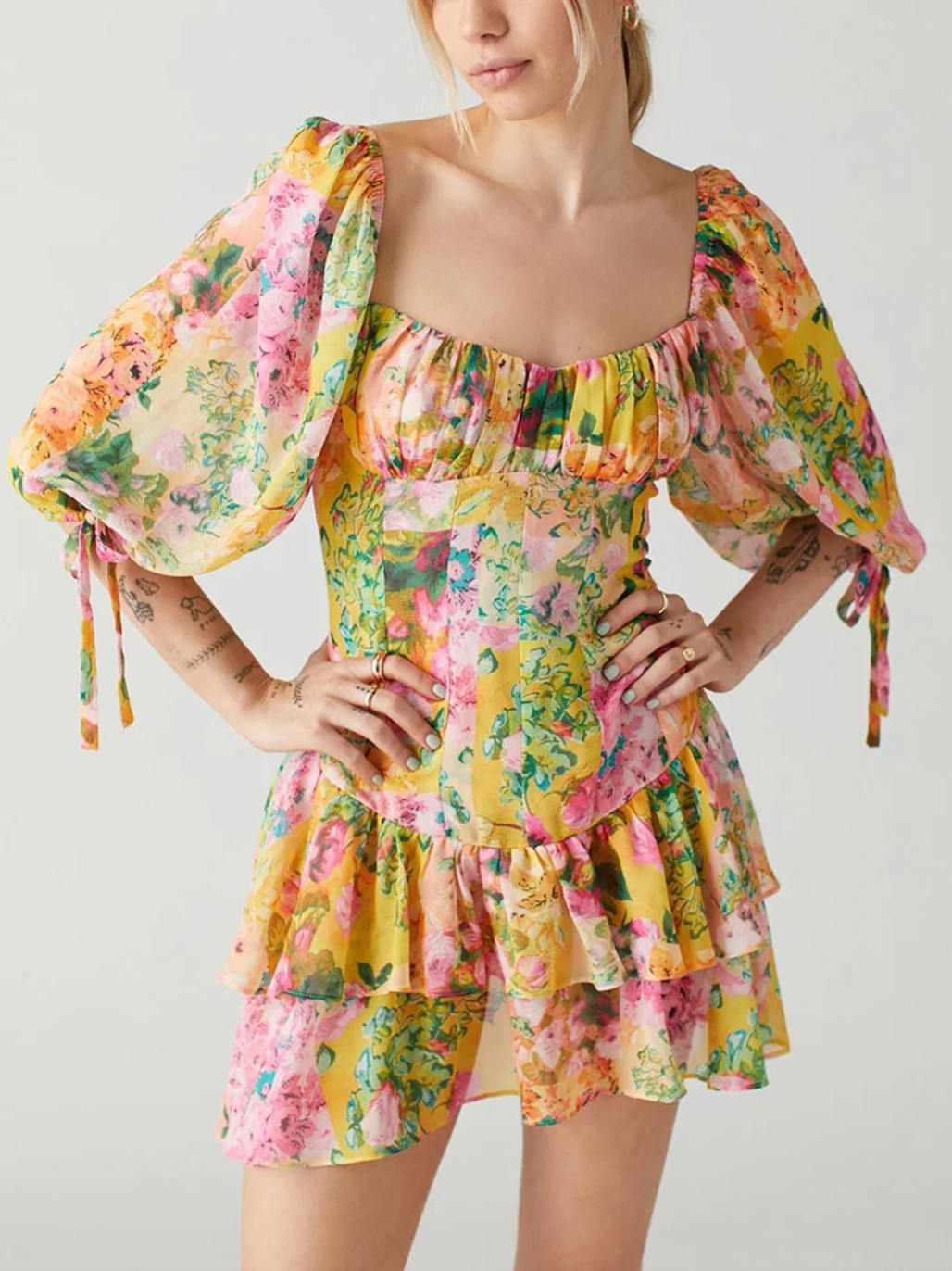 Introducing Dress Nina - a French styled mini dress perfect for your summer wardrobe. With a beautiful yellow floral print and tiered lantern sleeves, this dress is sure to turn heads. The backless design adds a touch of sexiness, making it a versatile piece for any occasion. Be chic and stylish with Dress Nina!