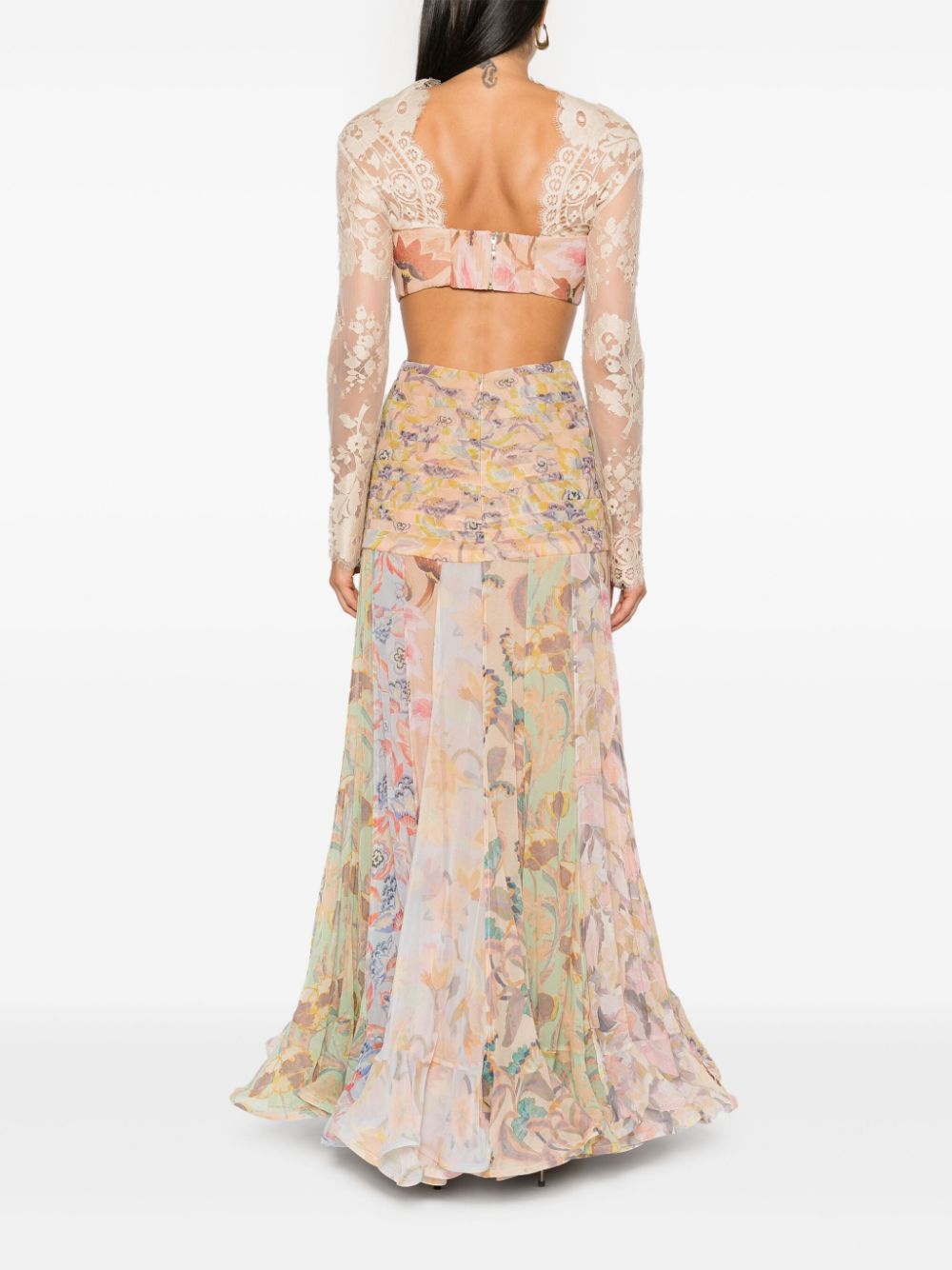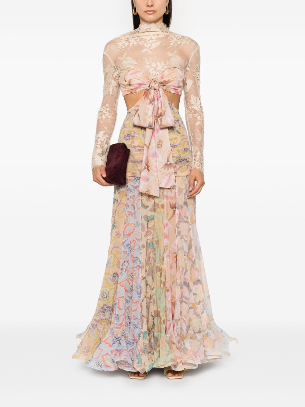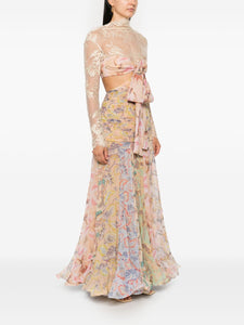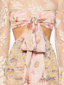 Introducing the Eden Flounce maxi dress. Crafted from luxurious silk, this dress features a delicate floral print, intricate lace and cut-out detailing, and a high neck with bow accents. The pleated and scalloped hem adds a touch of elegance to this exquisite piece.