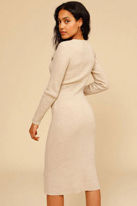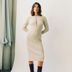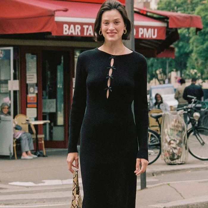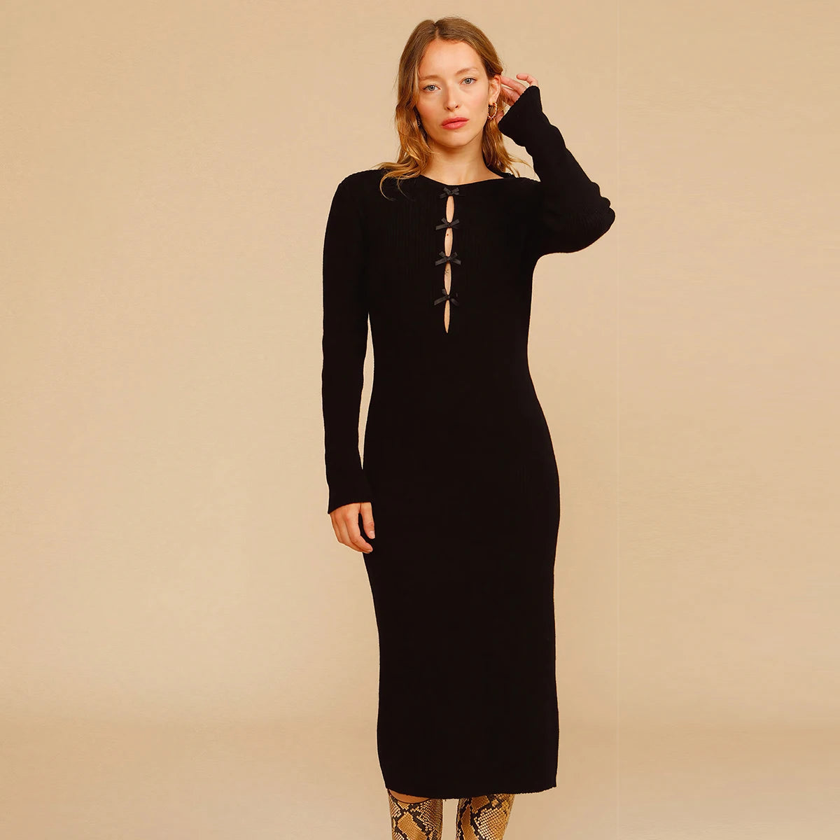 Experience effortless chic this autumn and winter with our Elona Midi Dress. Made from high-quality rib knit fabric, this vintage cutout dress features a figure-hugging silhouette, cascading cut-outs with bows, and a crew neckline. Perfect for work from home or dressing up on off-duty days. Complete the look with mid-calf heeled boots and a snakeskin baguette bag.