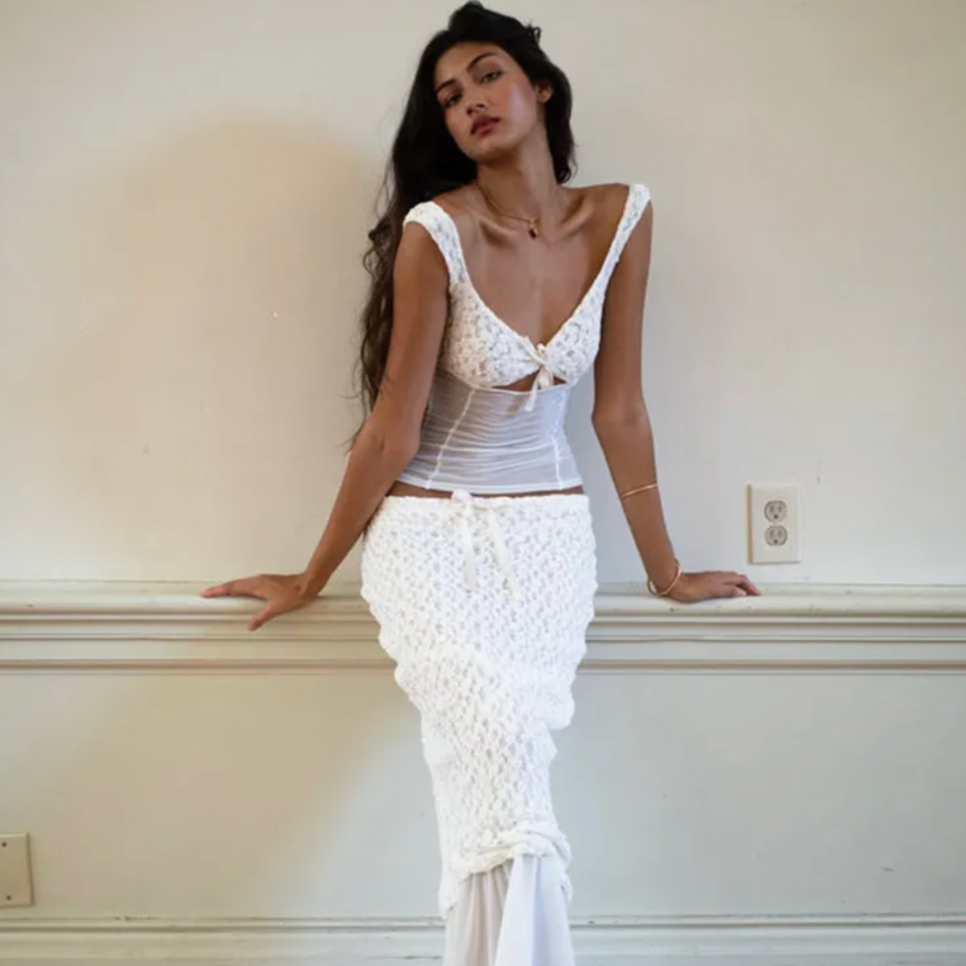Elevate your wardrobe with our Ensemble Lianna, the perfect combination of sexy and sophisticated. This two piece set features a white spaghetti strap crop top and a long skirt made of delicate see-through lace. Perfect for any occasion, this slim and casual suit will make you stand out and radiate confidence.