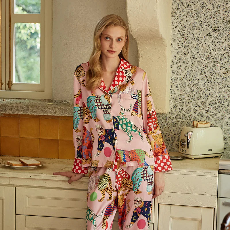 Stay comfortable and stylish in our Ensemble Stacy silk pajamas. Crafted from luxurious silk, these long-sleeved pajamas feature a sophisticated lapel and are perfect for lounging at home. Indulge in the ultimate relaxation experience with our fashionable silk pajama set.