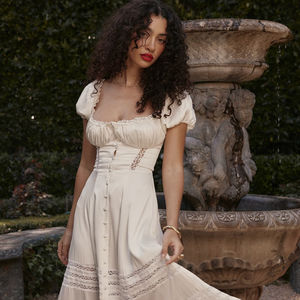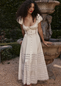 Our ultra luxe Eviana dress is the first of our new real silk range and is cut from the most exquisite and lustrous real silk. Eviana evokes a fun and feminine vibe with pretty puff sleeves and delicate lace detailing. It's blended with elastane for a comfortable stretch fit and is partially lined to mid thigh.