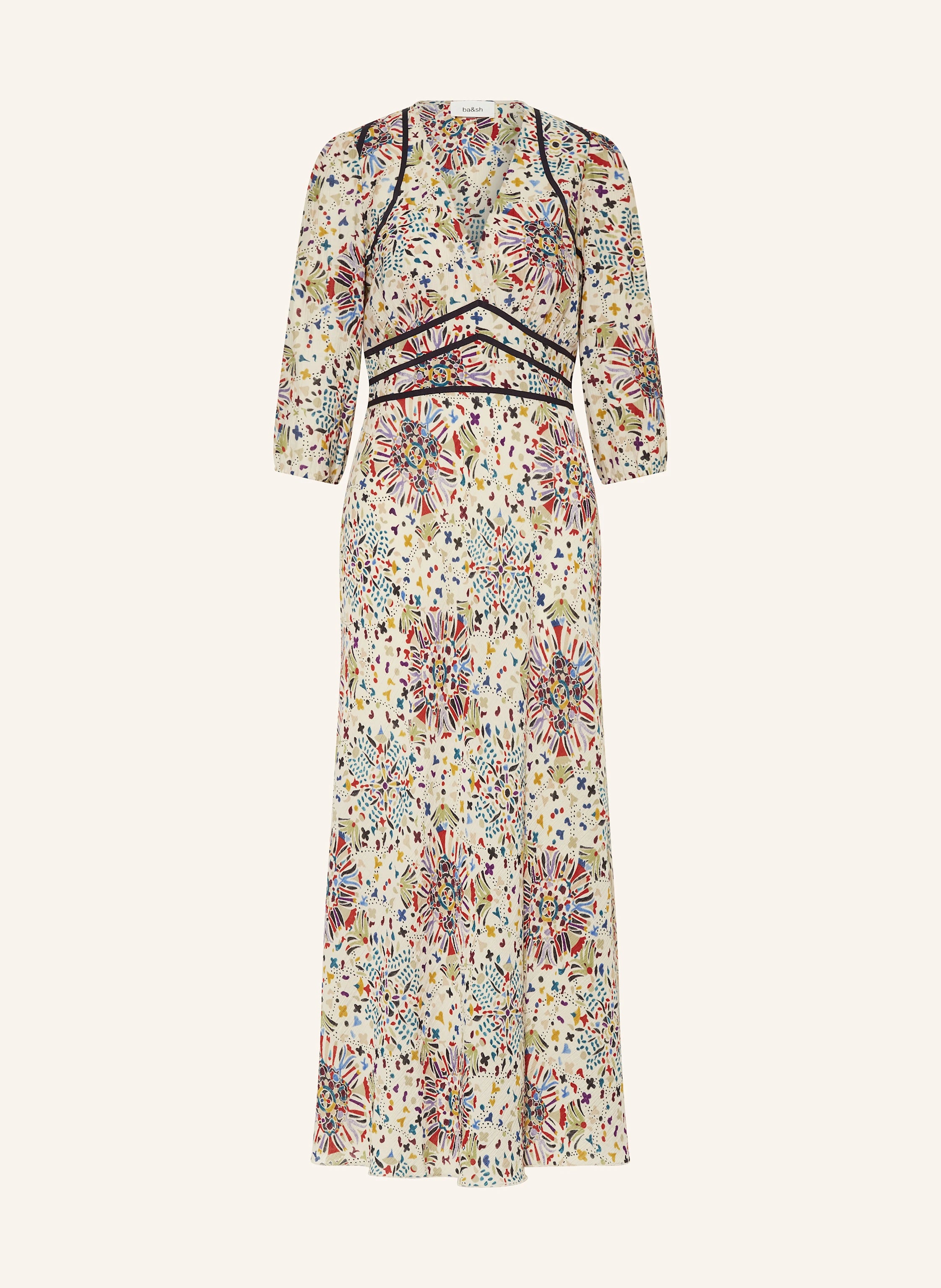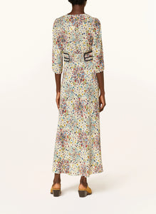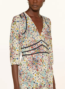 Upgrade your wardrobe with the Fazia Dress. Combining comfort and style, this versatile piece features a flowy fabric, elastic sleeves, and cinched waist for a flattering fit. The deep V-neck and modern graphic print make it a must-have for any occasion.