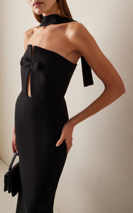 Elevate your party wardrobe with the 'Holly in Sing Sing' maxi dress. This dress exudes retro glamour with a hedonistic edge. The sleek pencil silhouette is highlighted by a structured bow detail and alluring cutout. Add vibrant pumps for a burst of color.