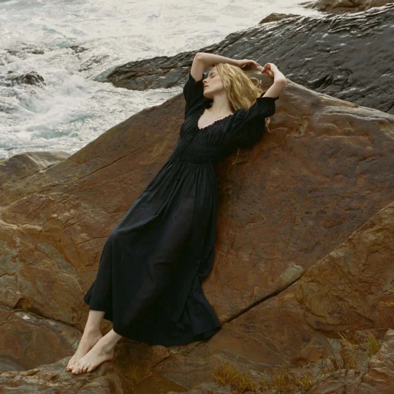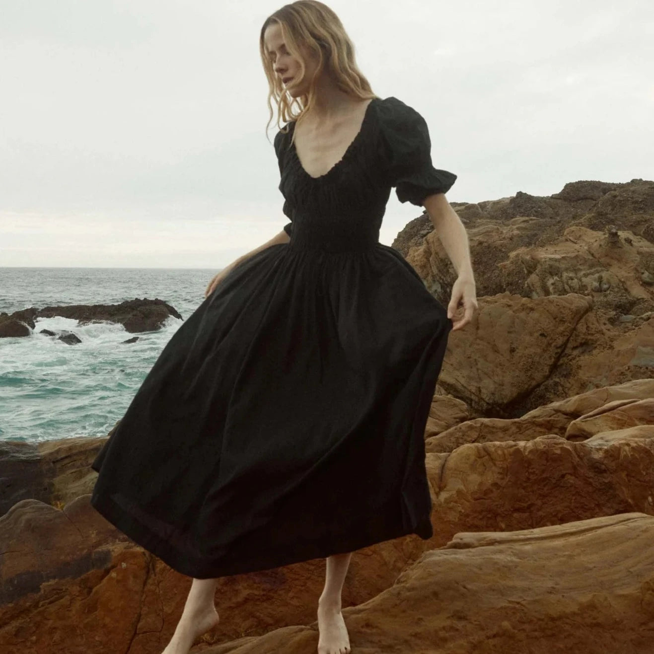 In a soft, lightweight blend of organic cotton and viscose, the Ischia Dress—a Favorite Character that made its debut in Spring 2021 and remains a bestseller—features double-puffed elbow-length sleeves and a scoop neckline accented with a functional center tie. A smocked bodice gives way to a full, ankle-grazing skirt, while a waist tie allows you to adjust the fit. Petite ruffles adorn the sleeve cuffs and neckline.