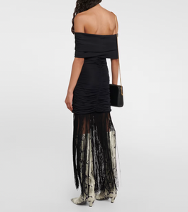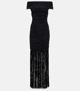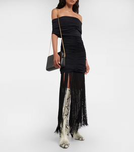 Introducing the Jacinta Maxi Dress - a fusion of elegance and modernity. This luxurious slip-on dress boasts an off-shoulder neckline, adorned with long fringes and full ruching for a flattering silhouette. Perfect for any special occasion, elevate your style with this sophisticated must-have.