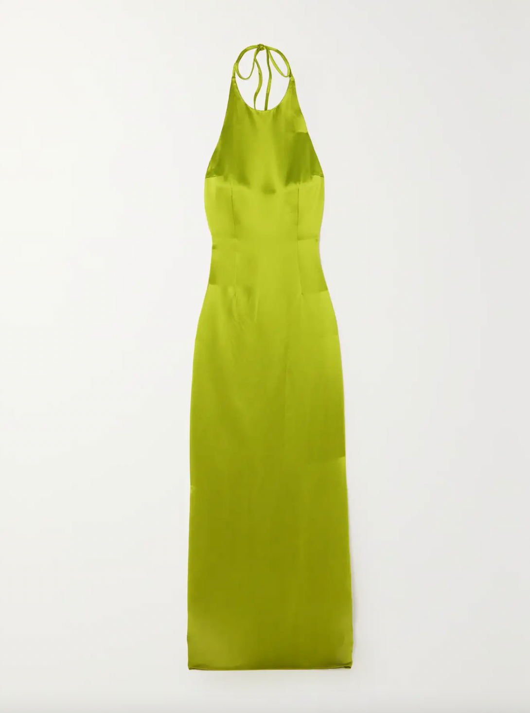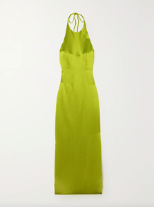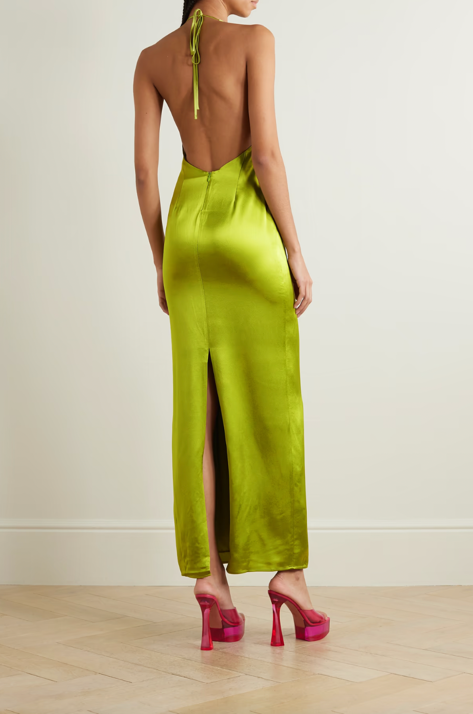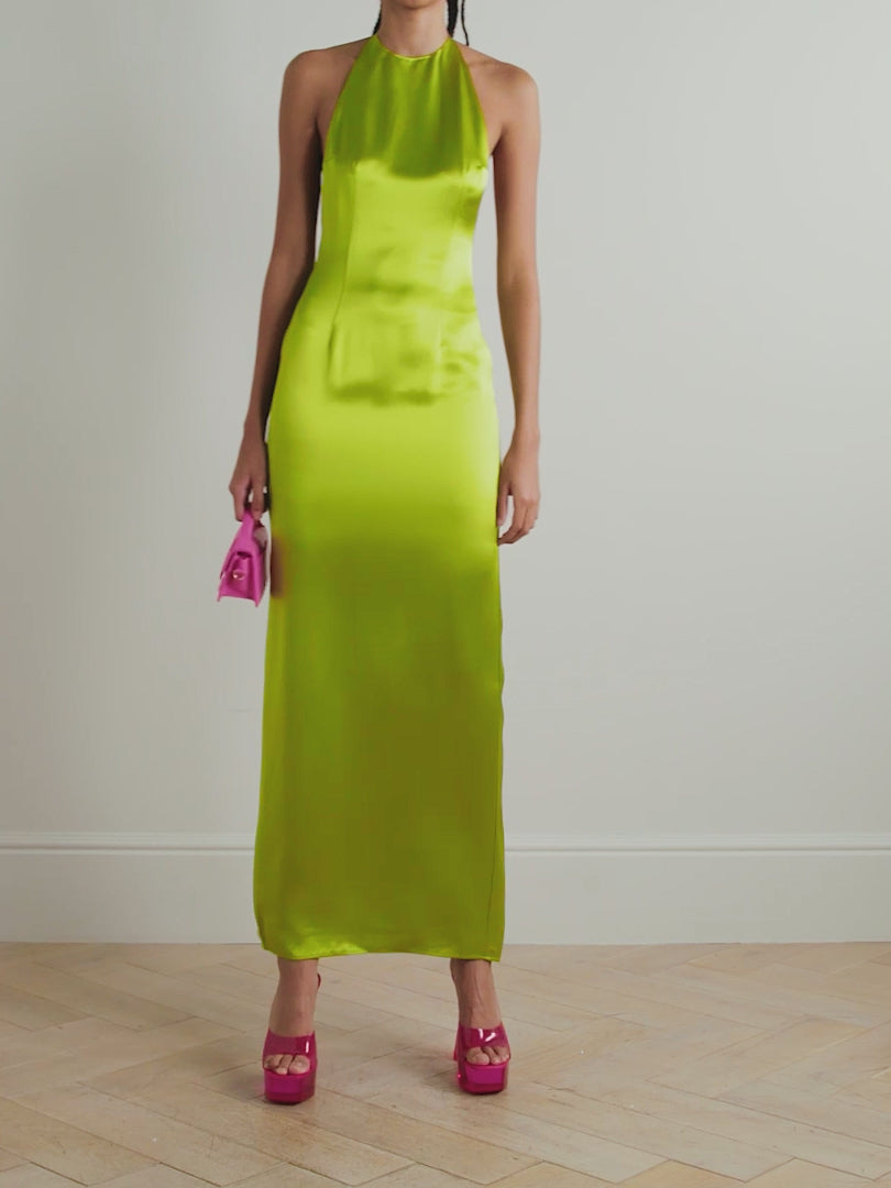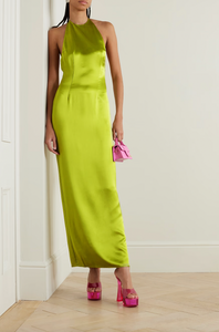 Elevate your style with the Janet Halterneck Maxi Dress. This stunning chartreuse satin dress not only skims your figure, but also features an adjustable halterneck for a perfect fit. Show off your back with the open design and complete the look with a delicate body chain. Make a statement with this elegant and versatile dress.