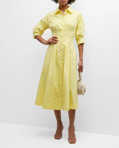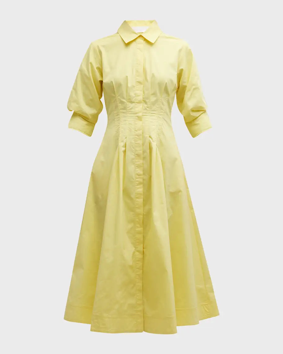 Expertly crafted from a cotton blend, the Jazz Cotton Poplin Pintuck Midi Shirtdress features pintuck detailing on the flared skirt, a straight-point collar, and concealed front button fastening for a modern yet classic look. With three-quarter length puff sleeves and a full lining, this midi-length dress is both comfortable and stylish.