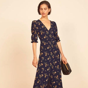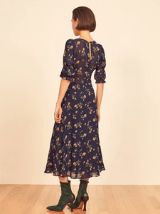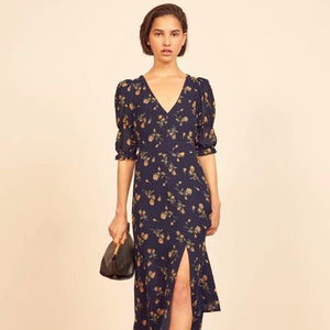Add a touch of elegance to any occasion with our Larchmont Dress. Featuring a stylish front slit and puffed sleeves with ruffle details, this midi dress is perfect for summer events. The vintage floral print adds a feminine touch to this sexy dress. Available for women, sizes S-XL.