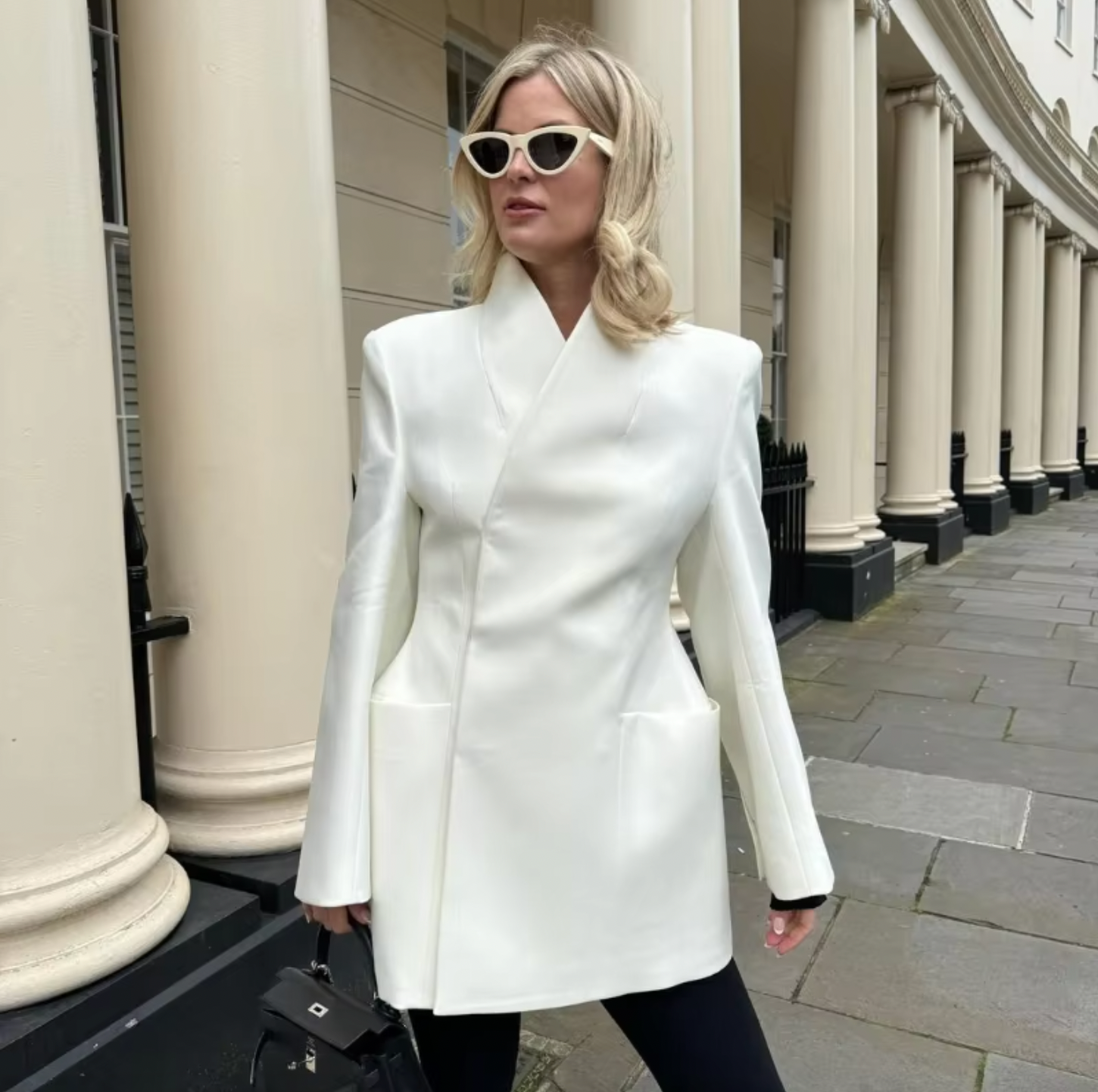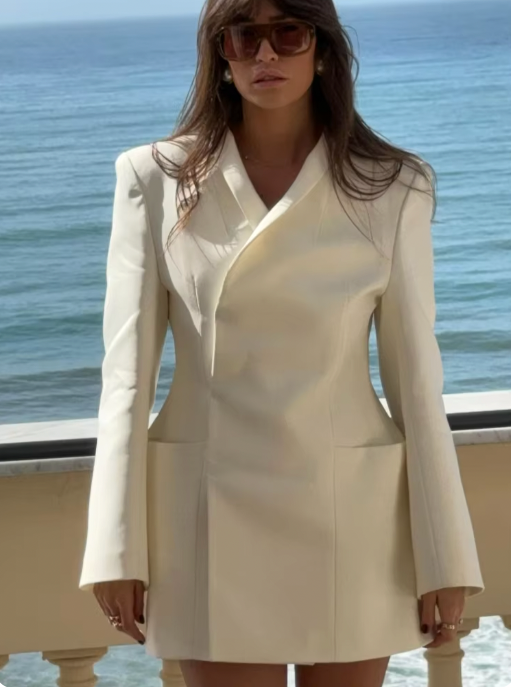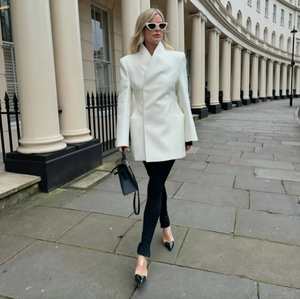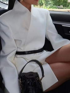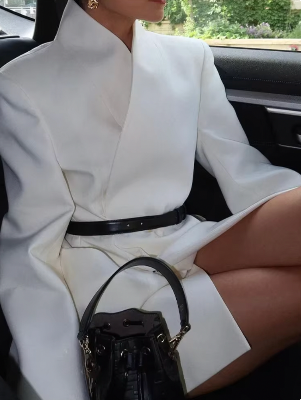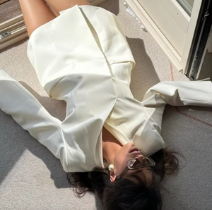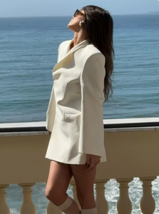 Introducing the Laurel Wrap Blazer, a must-have addition to your wardrobe. Crafted from premium suiting fabric, its stand-collar and lapelless design exude sophistication. The cinched waist and padded shoulders create an elegant hourglass silhouette. With hidden buttons and inset pockets, this blazer is the epitome of luxury and refinement. Dry clean only.