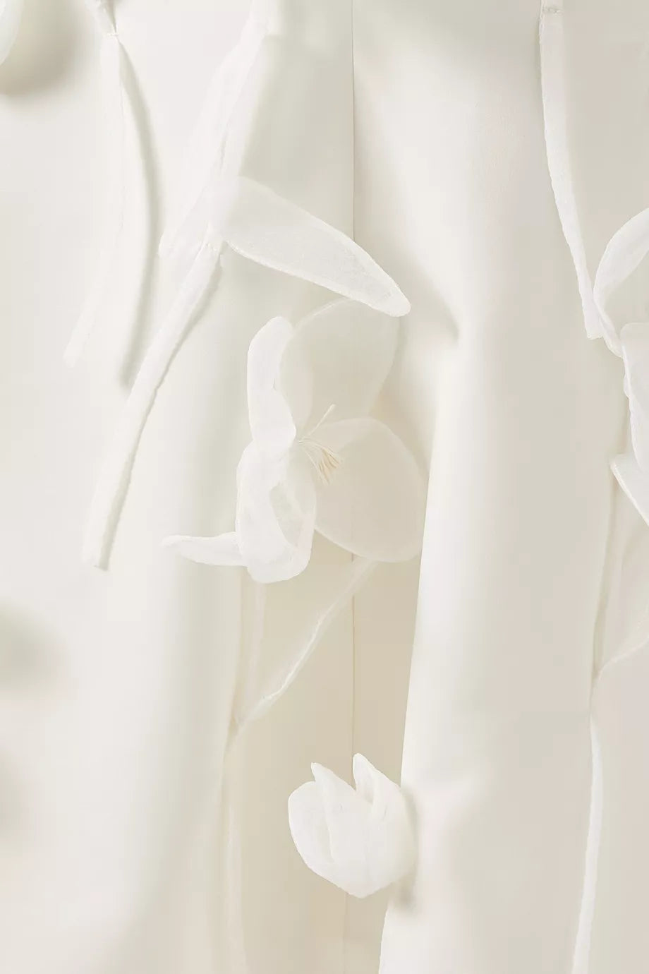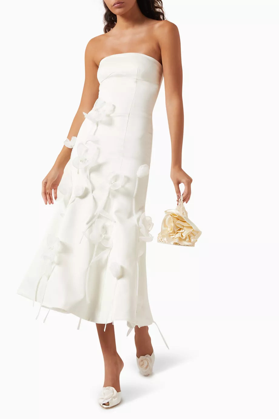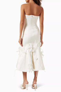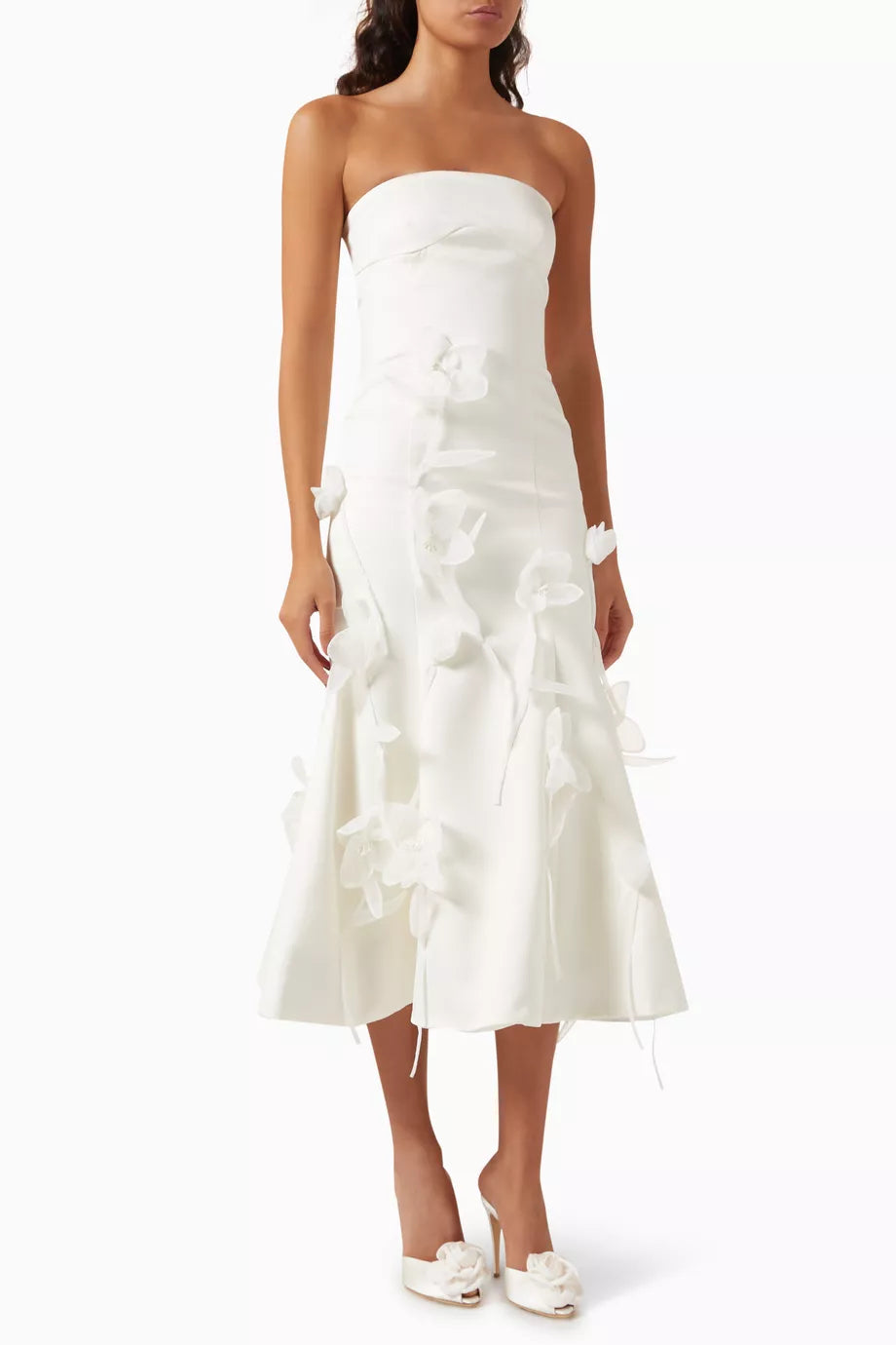 Indulge in the beauty of blooming florals with the romantic yet modern Lily Midi Dress. The delicate 3D lily appliqués add a touch of couture-inspired artistry to the strapless bodice and flared midi skirt. With a concealed back zipper and A-line silhouette, this dress moves gracefully with you.