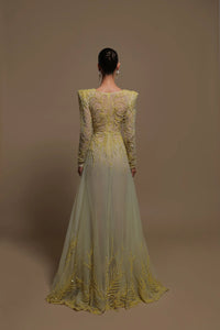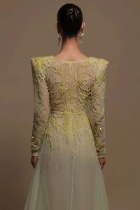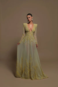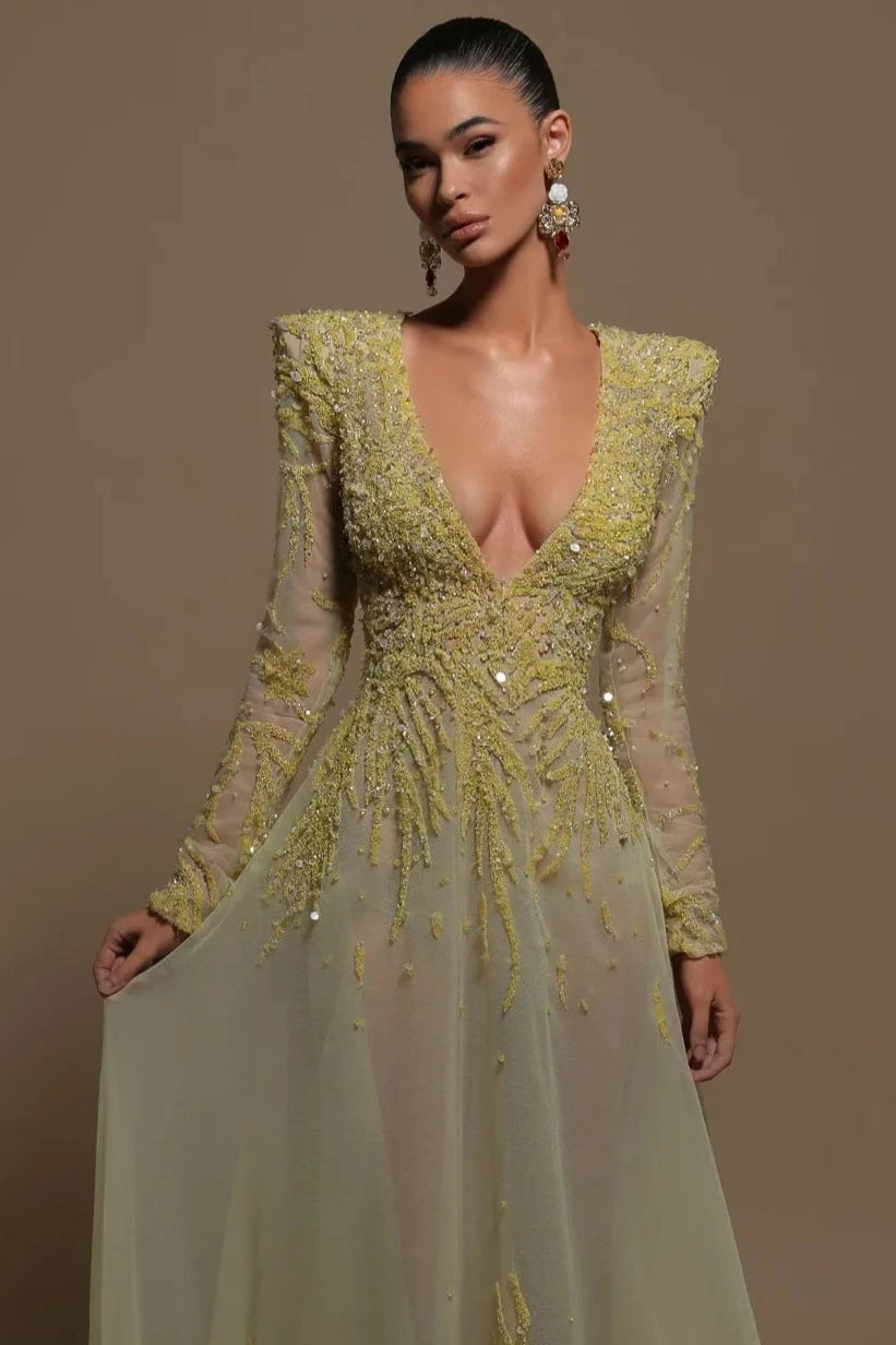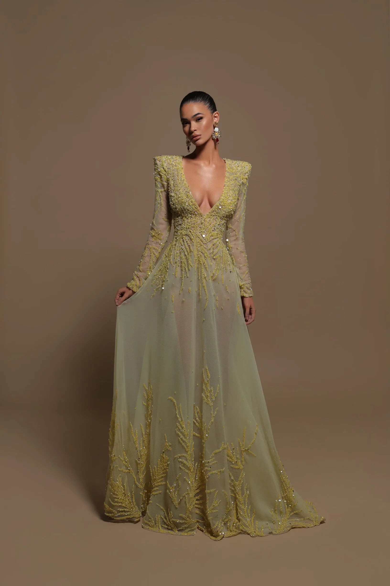 Expertly crafted, the Manette Gown combines a V-neckline and long sleeves with embellished details and shoulder pads. Making a timeless statement, this evening dress effortlessly flatters your figure and exudes elegance. Elevate your look with this stylish and sophisticated piece.
