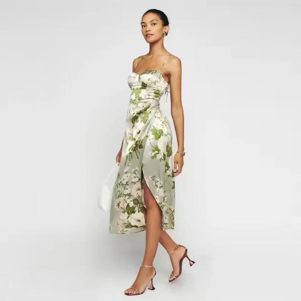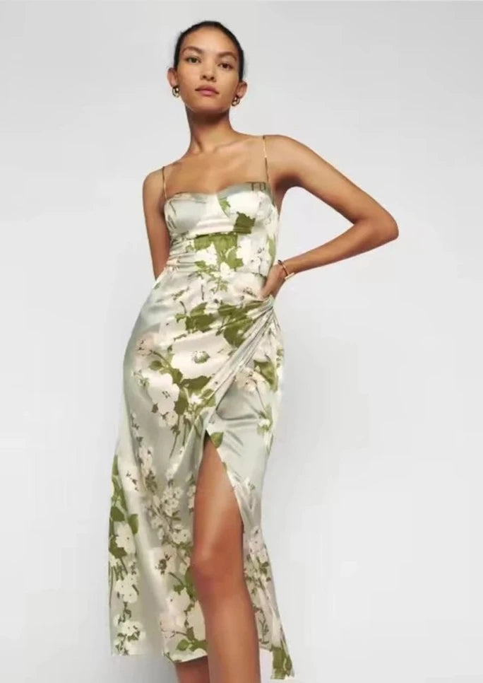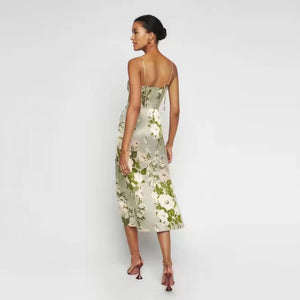 This elegant Marguerite Dress boasts a vintage floral design and features satin frill sleeves, a sleeveless cut, and a lace-up ruffle hem. Perfect for any formal occasion, the dress exudes a timeless charm with its delicate details and high-quality fabric. Add a touch of sophistication to your wardrobe with this stunning dress.