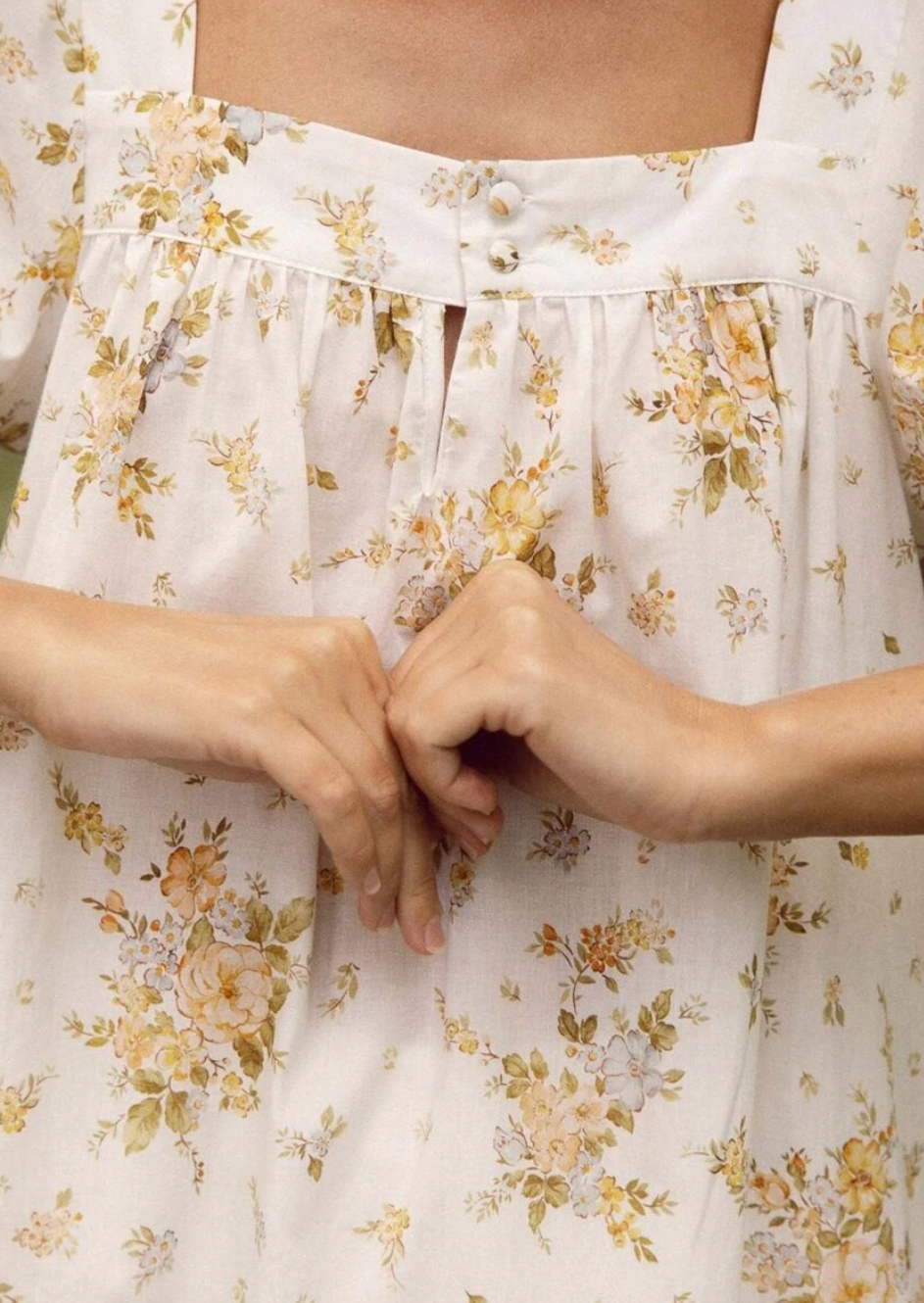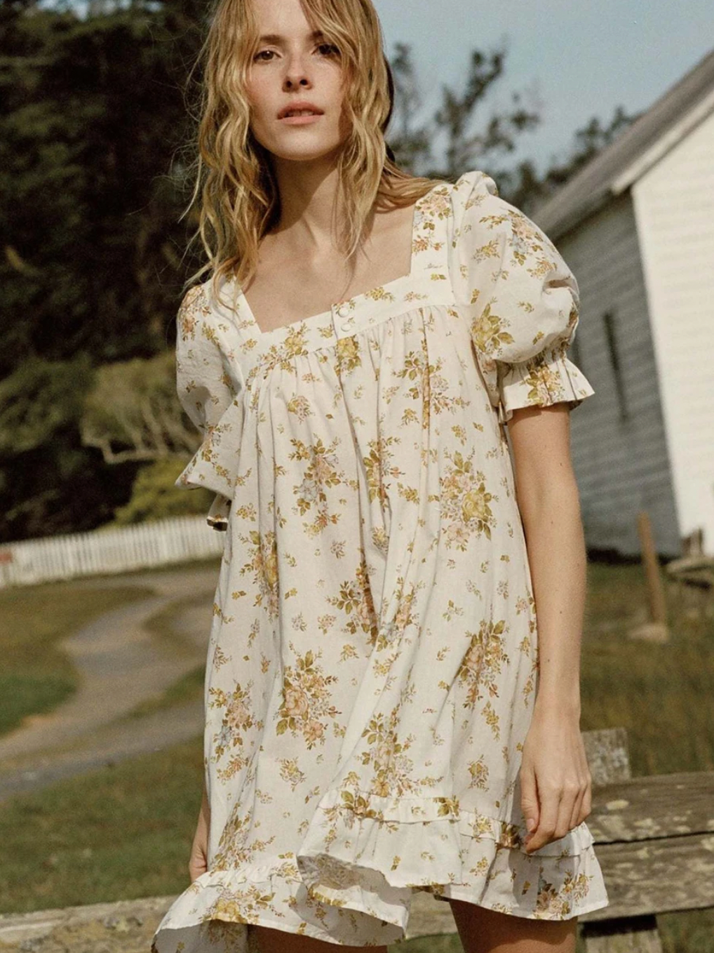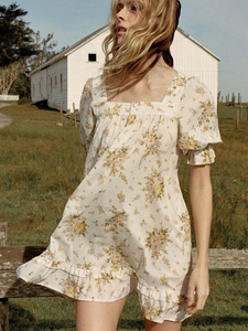 Indulge in the luxuriously chic Mini Dress Etoile. With its square collar and delicate French floral print, this dress exudes elegance and sophistication. The short puff sleeves and loose, ruffled design add a sweet and feminine touch. Perfect for any occasion, embrace the art of fashion with this must-have piece.
