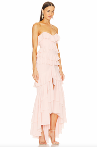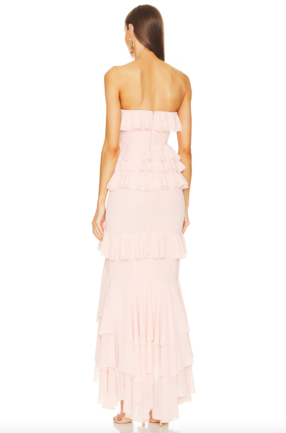 Elevate your style with the Oleksandra Maxi Dress. This luxurious, rose-colored dress features ruffled details and a daring open back, perfect for making a statement at any event. The flowy, sleeveless design and off-the-shoulder silhouette add a touch of elegance to this party-ready piece.