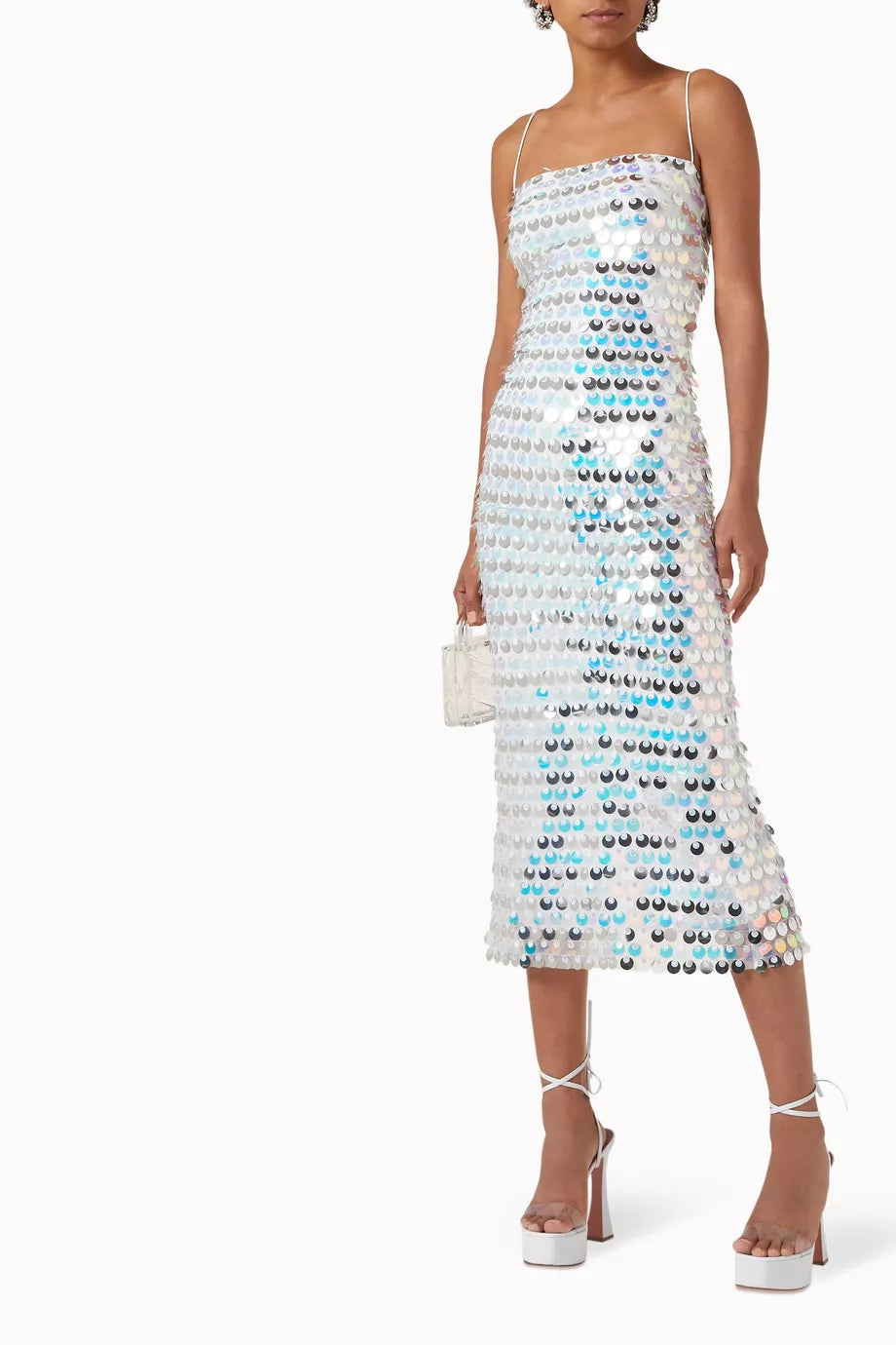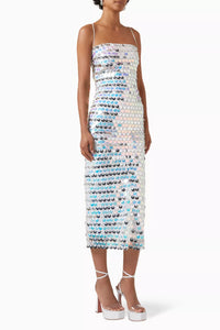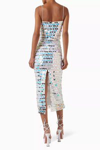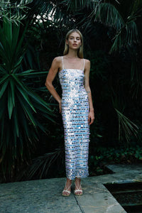 Introducing the Phoenix in Hawaiian Gardenia - a striking summer dress fit for any glamorous occasion. Made with glittering sequin fibers, this dress features a sleek, slit design and a silver bandage for a sophisticated touch. Elevate your evening look with this elegantly styled dress.
