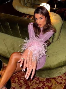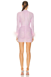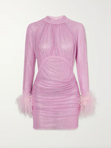 This Rhinestone Feather Mini Dress is a glamorous choice for any occasion. The eye-catching crystals and plush feathers will draw attention to your style, while the stretchy mesh fabric ensures a comfortable and close fit. Complete the look with high heels and a mini bag for a truly dazzling ensemble!