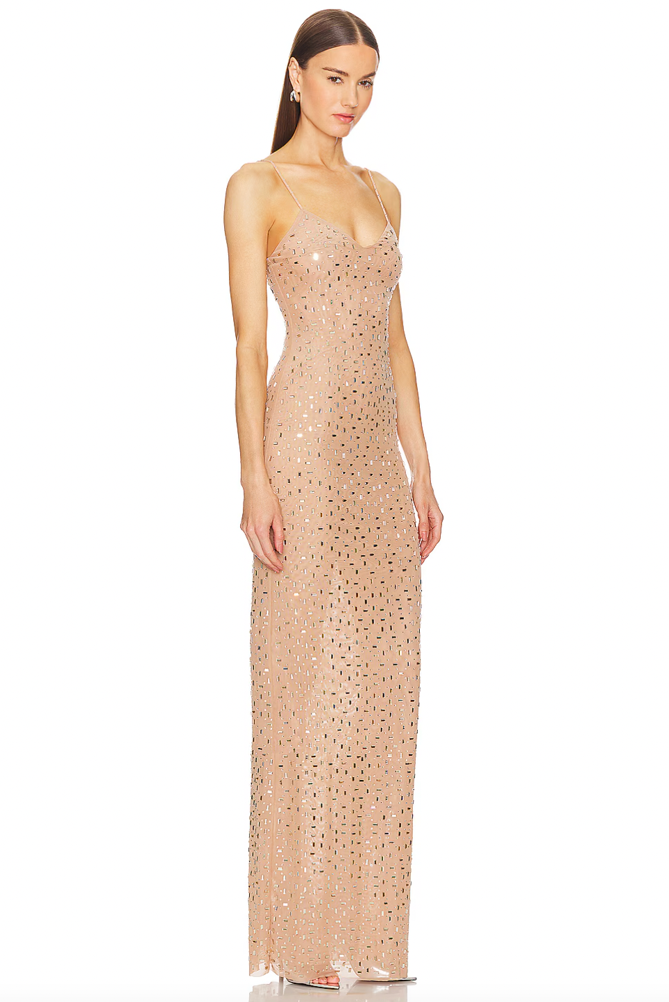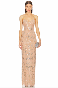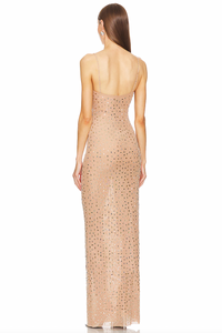 Step into luxury with the Rhinestone Mesh Maxi Dress. Fully lined for comfort, the hidden side zipper closure adds ease to this statement piece. Made with heat-stamped crystals, the mesh fabric shimmers with every movement. Elevate your style and dazzle the crowd in this showstopping dress!