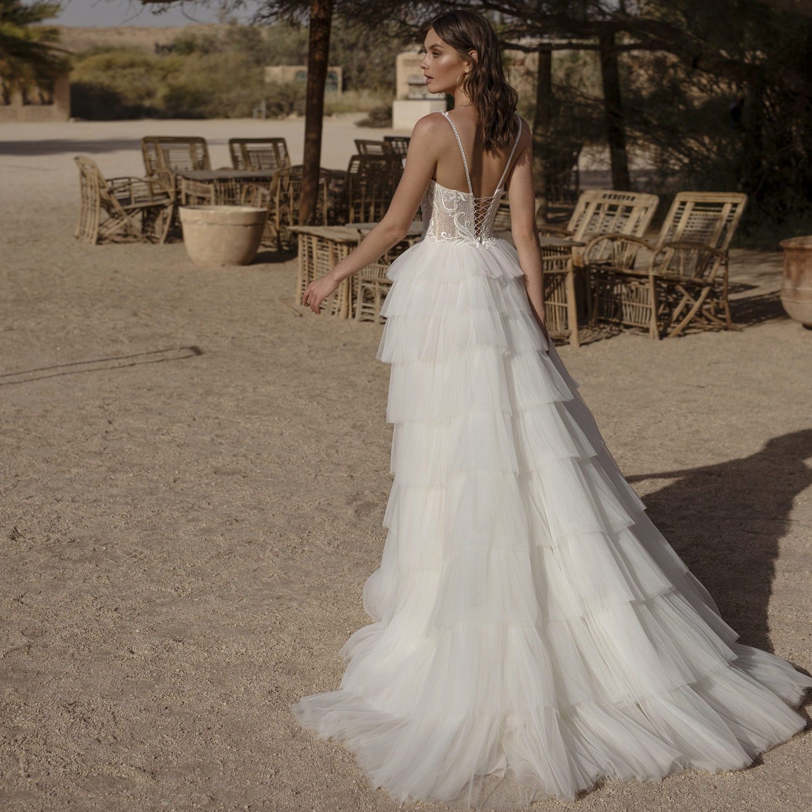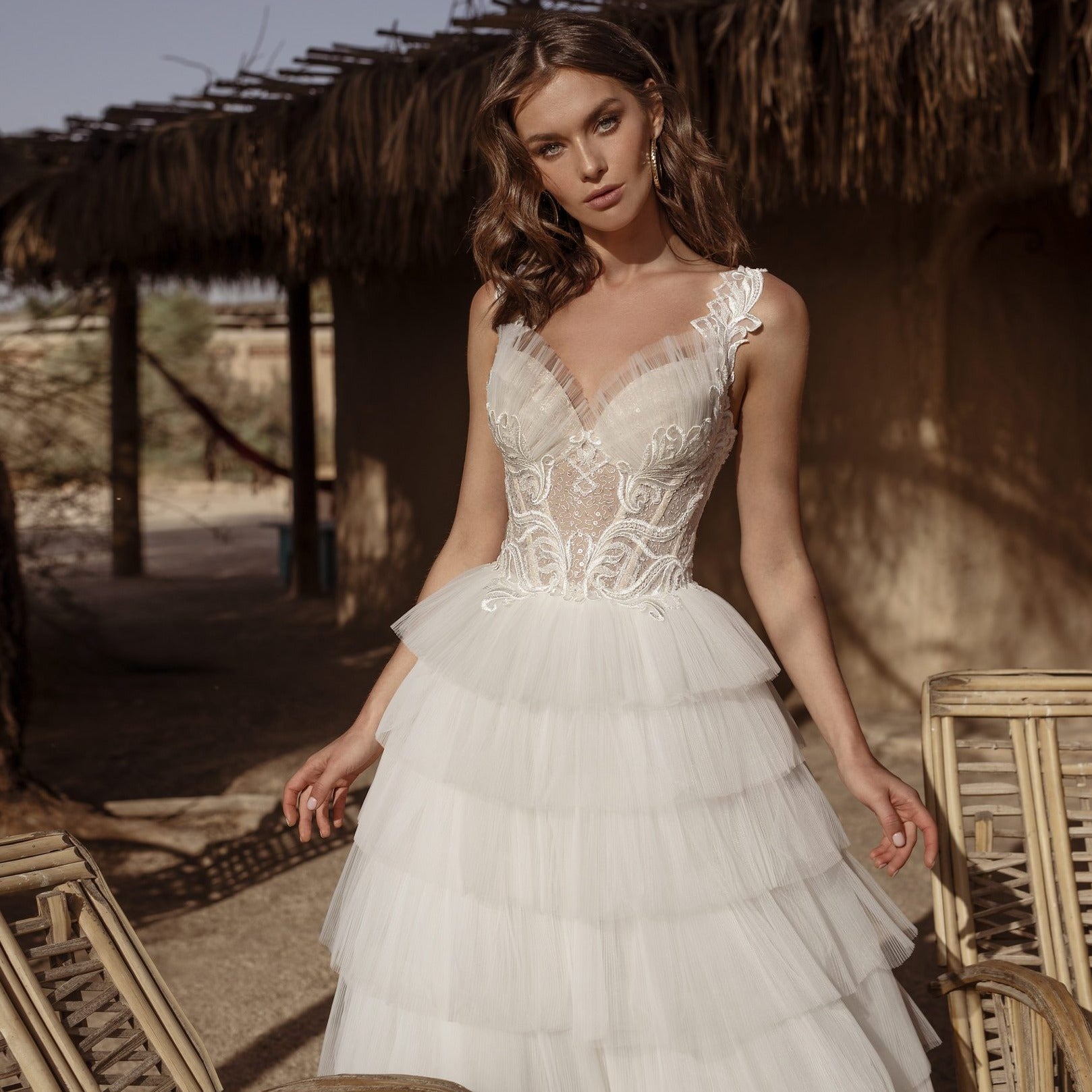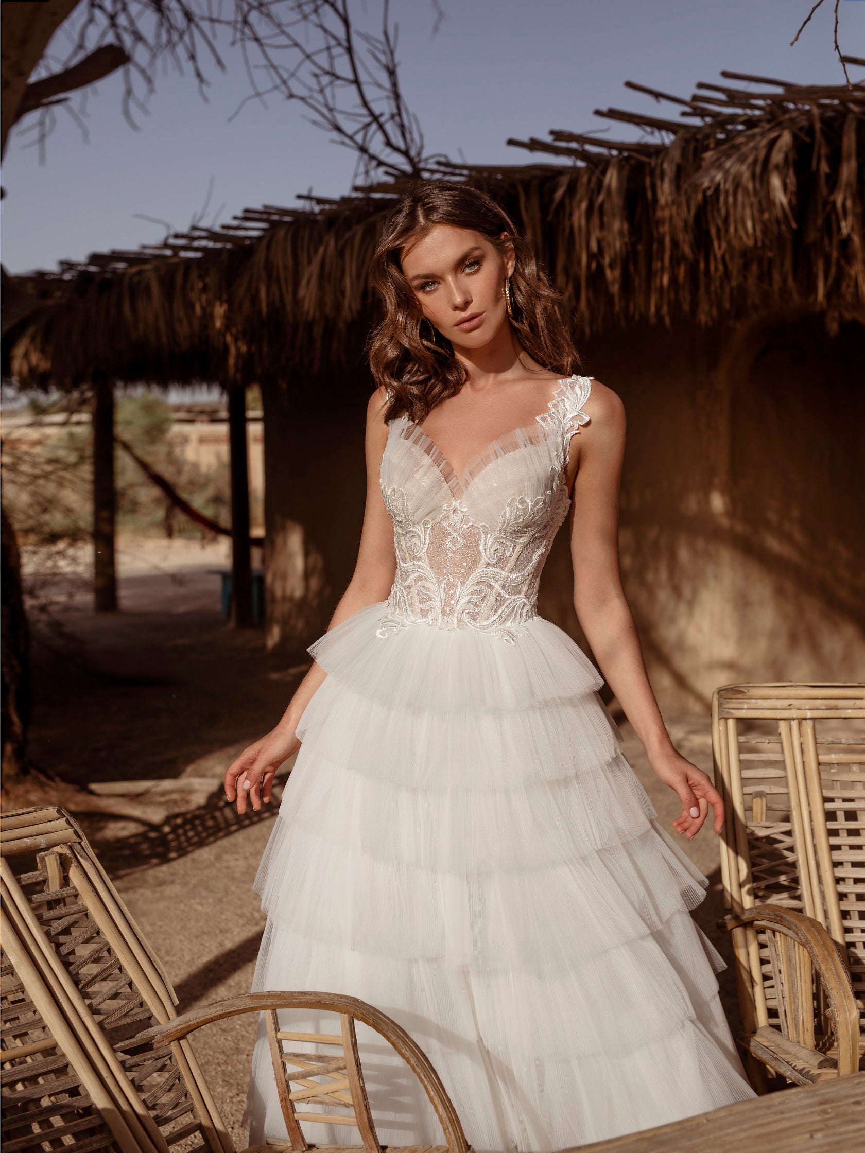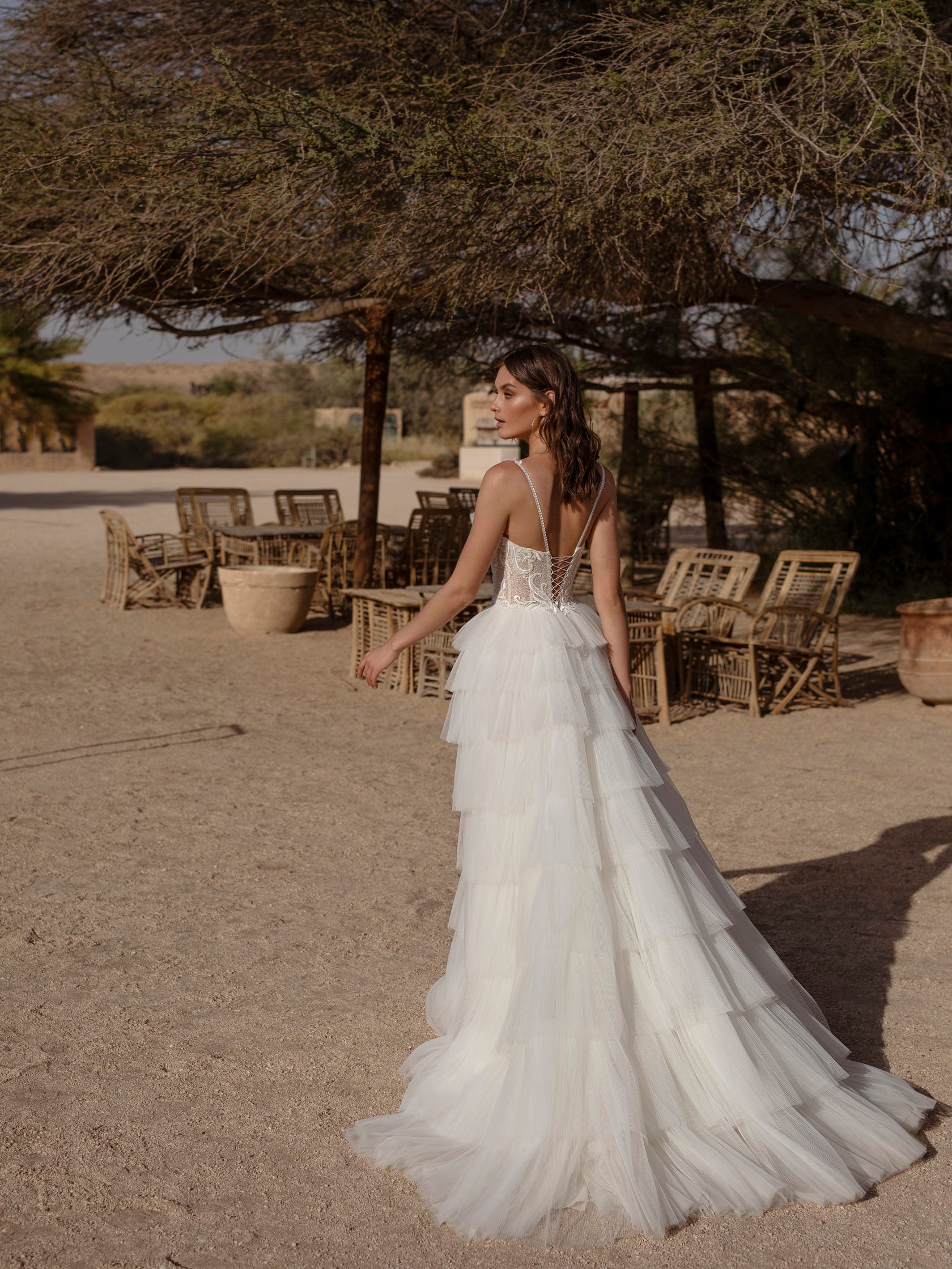 Look stunning on your wedding day in Robe Aluisa. This beautiful desert-style bridal gown features a ruffled line and sleeveless design, perfect for any wedding occasion. Crafted from luxurious fabrics, this gown will make you feel like the beautiful, blushing bride you are.