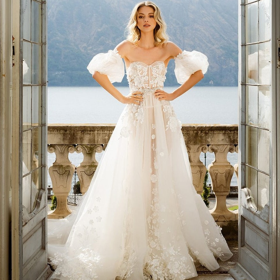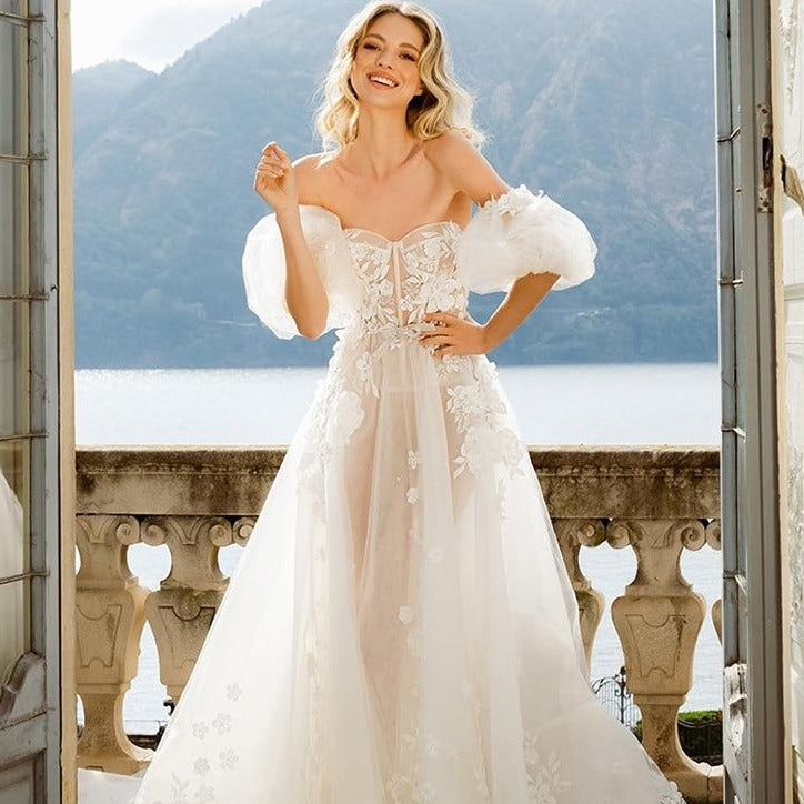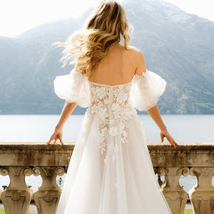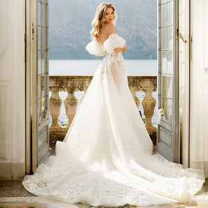 Make a bold statement on your special day with the Robe Amiya. Featuring luxurious tulle fabric, puff sleeves, intricate lace appliques, 3D flowers, and a backless design, this dress speaks to the risk-taker in you. Dare to stand out and be unforgettable!