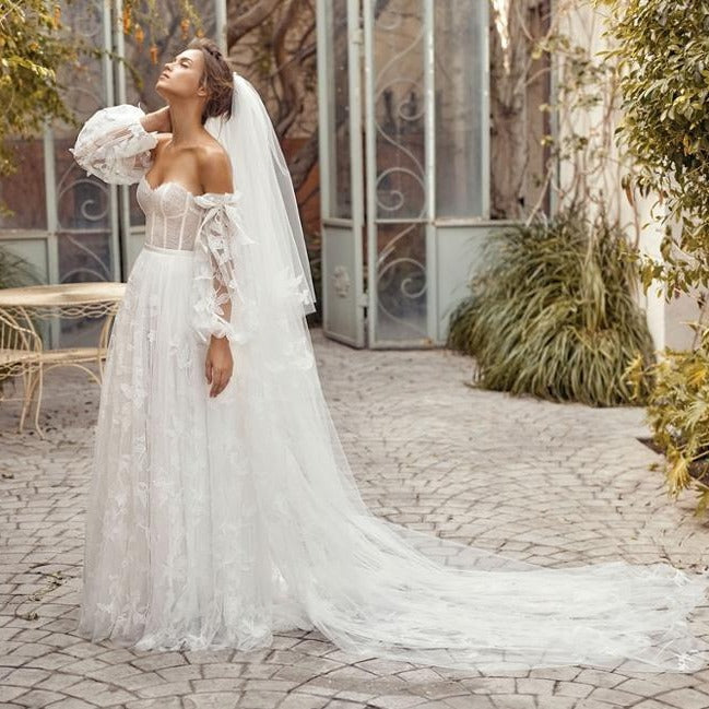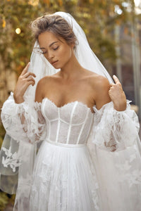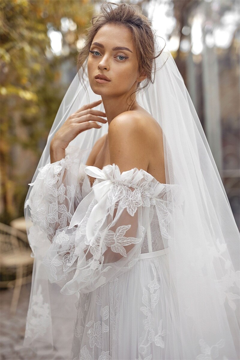 Indulge in luxury with our Robe Auburne, an elegant wedding gown featuring delicate embroidered lace and a chic long veil. This dress will make you feel like a work of art as you walk down the aisle, exuding sophistication and exclusivity. Elevate your special day with an exquisite touch of fashion.