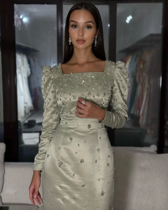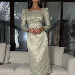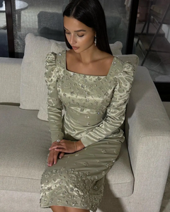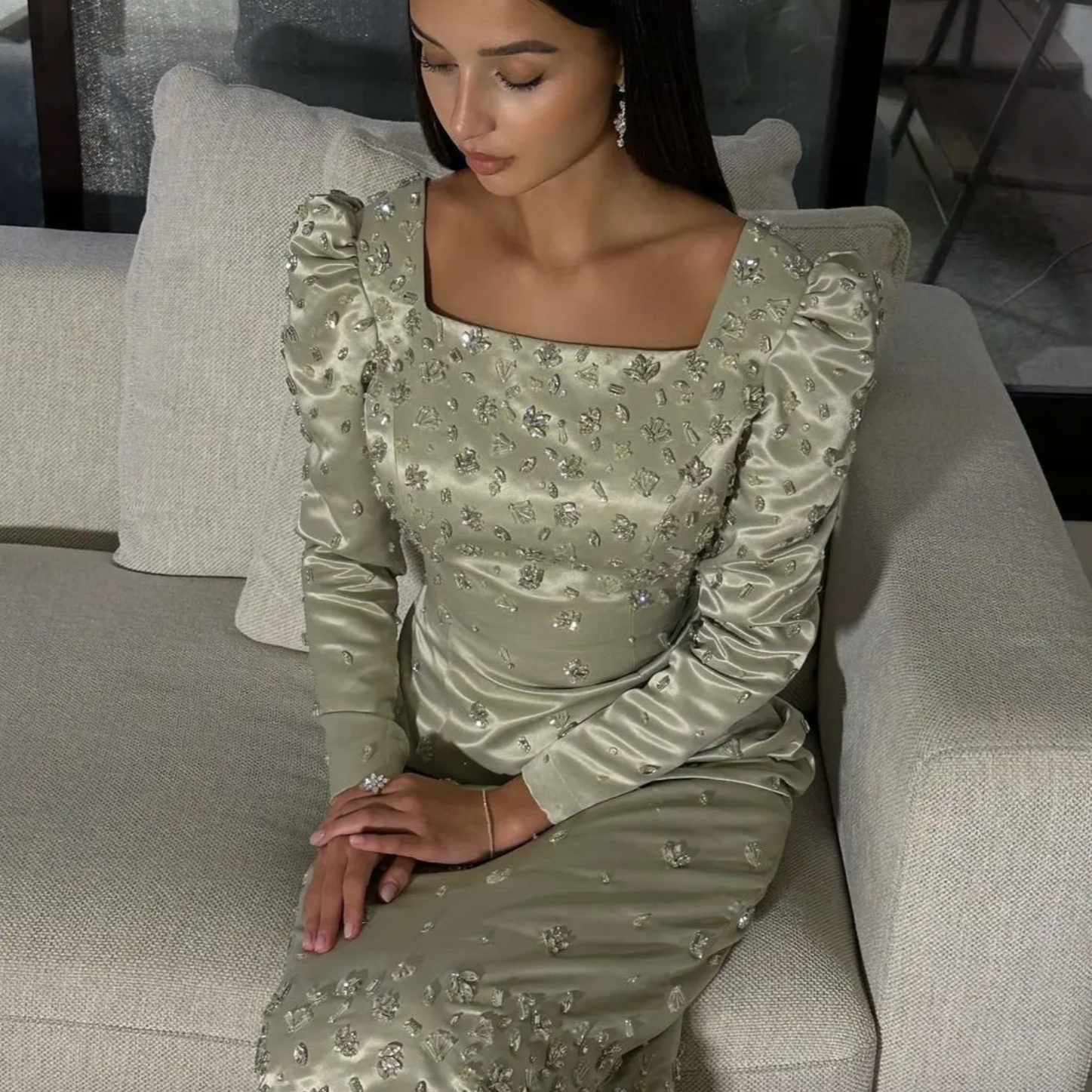 Light up the night with the sparkly Robe Augusta! This dress' elegant square neckline and long sleeves are encrusted with delicate handbeadings to make heads turn whenever you enter the room. Perfect for proms, weddings, and other special occasions! Don't miss out on this shining star!