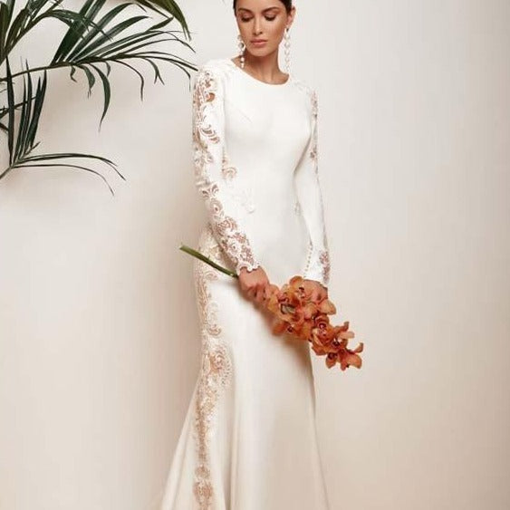 Look like a dream in the Robe Beatrix. This satin mermaid bridal gown is exquisitely simple, making it a timeless classic perfect for your special day. Capture hearts with an unforgettable look that will last a lifetime.